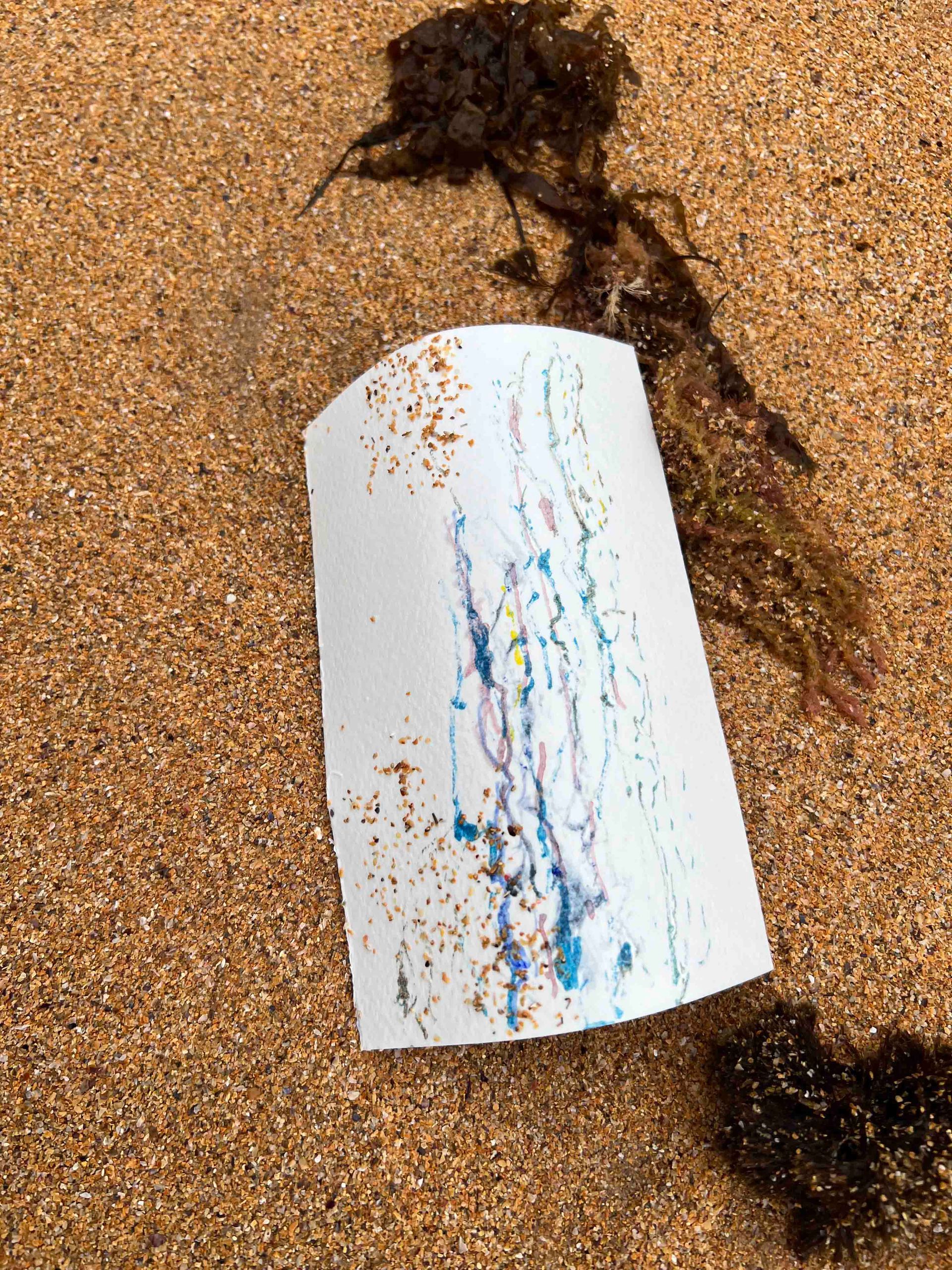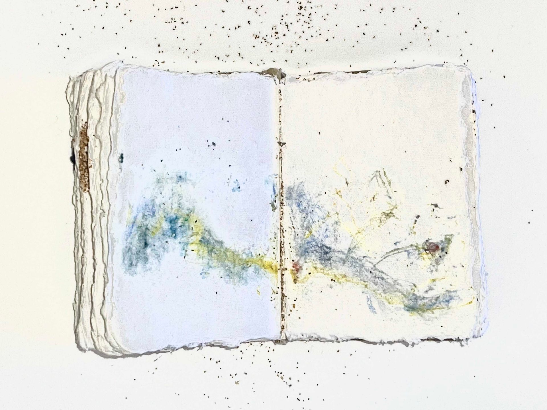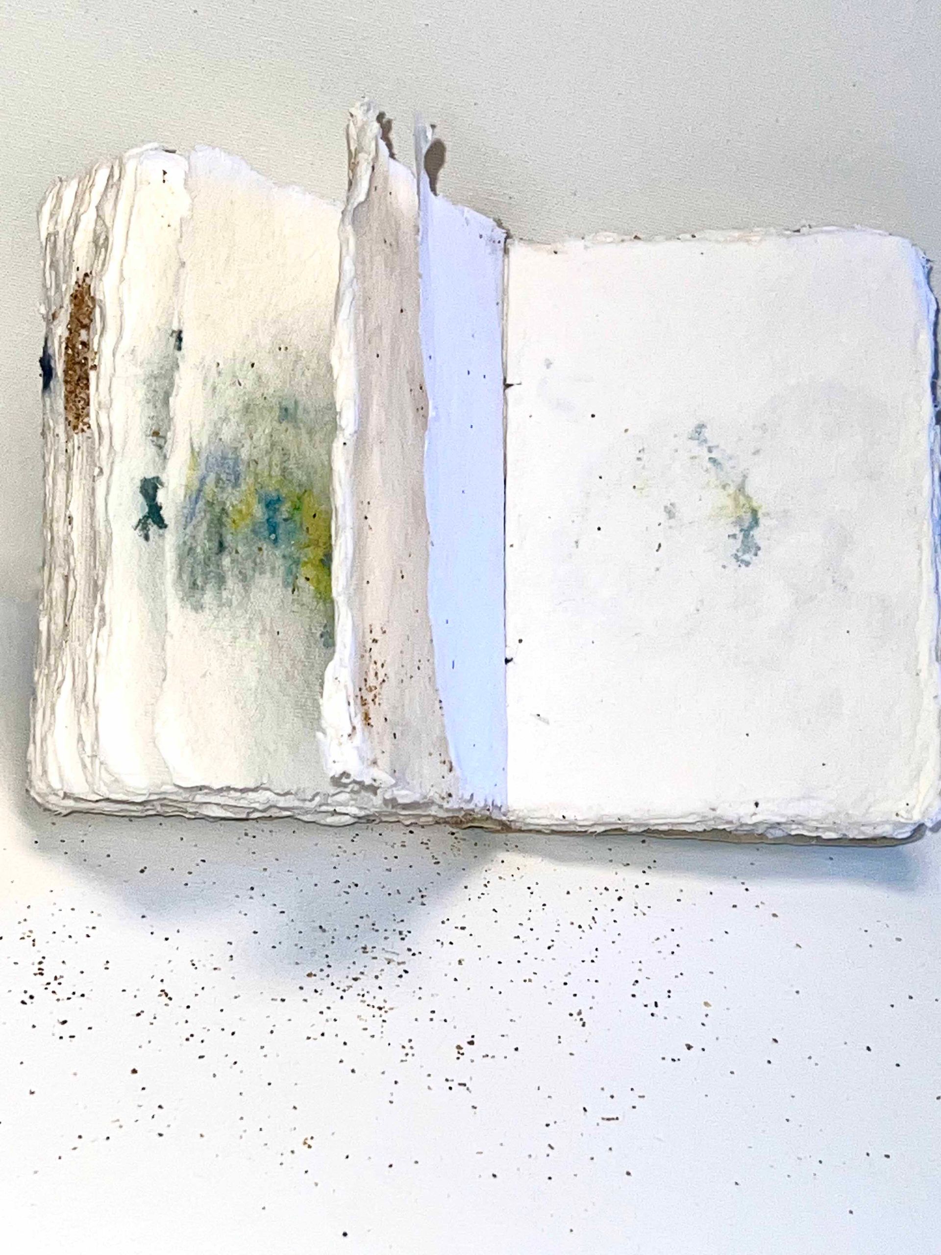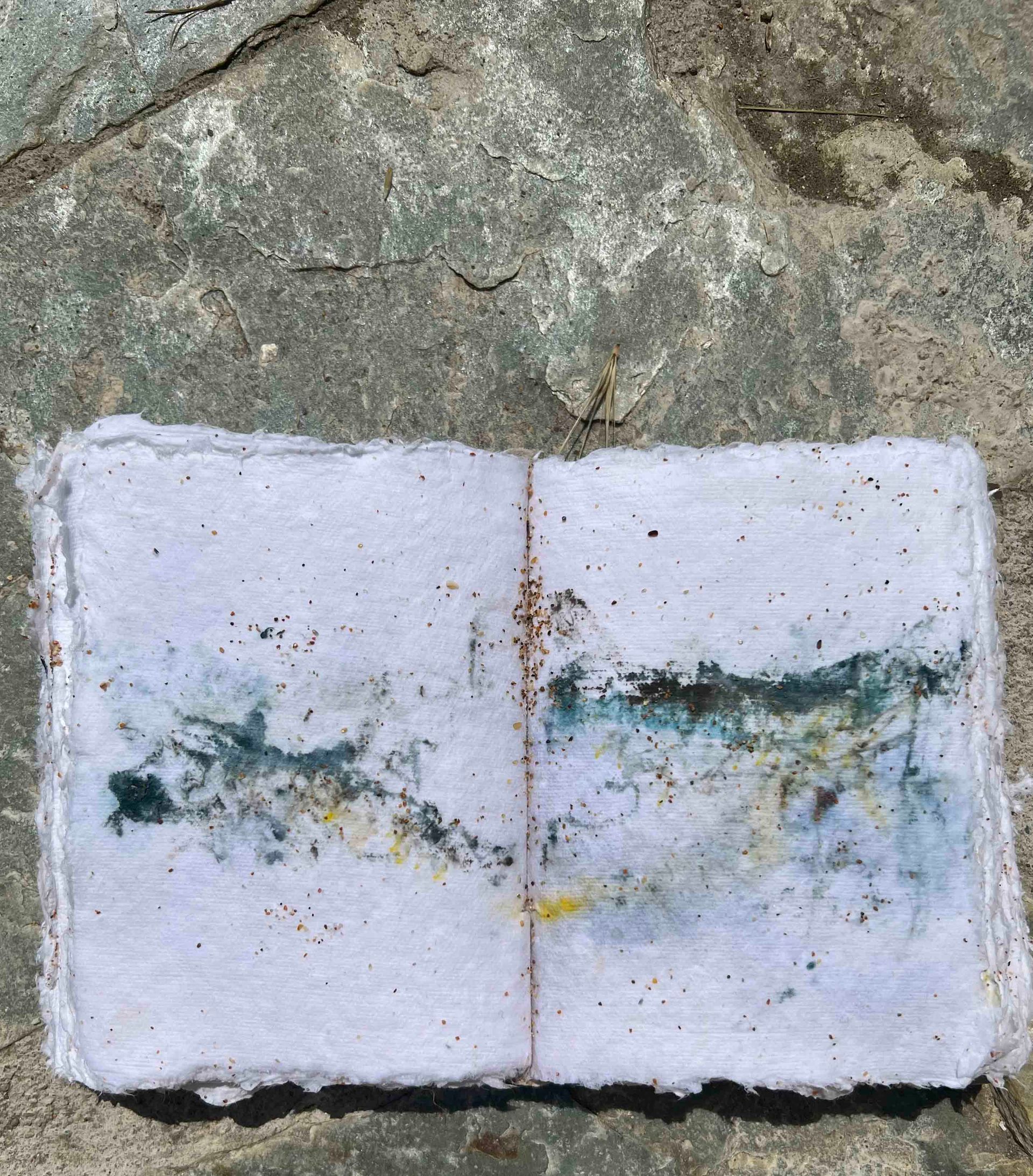 Explora las páginas de mi libro de artista, donde la historia de las cuevas y el poder del mar se entrelazan en cada obra.