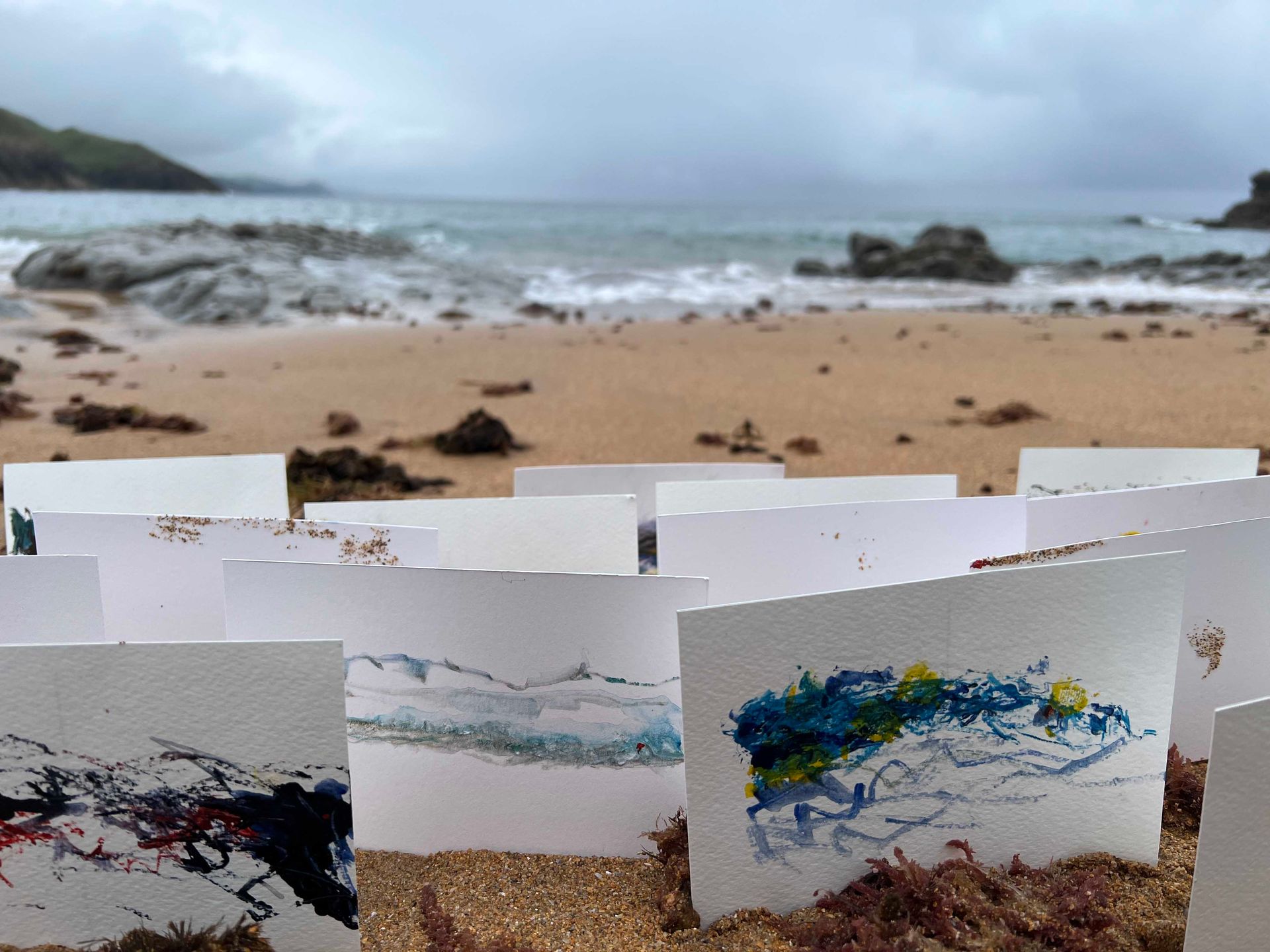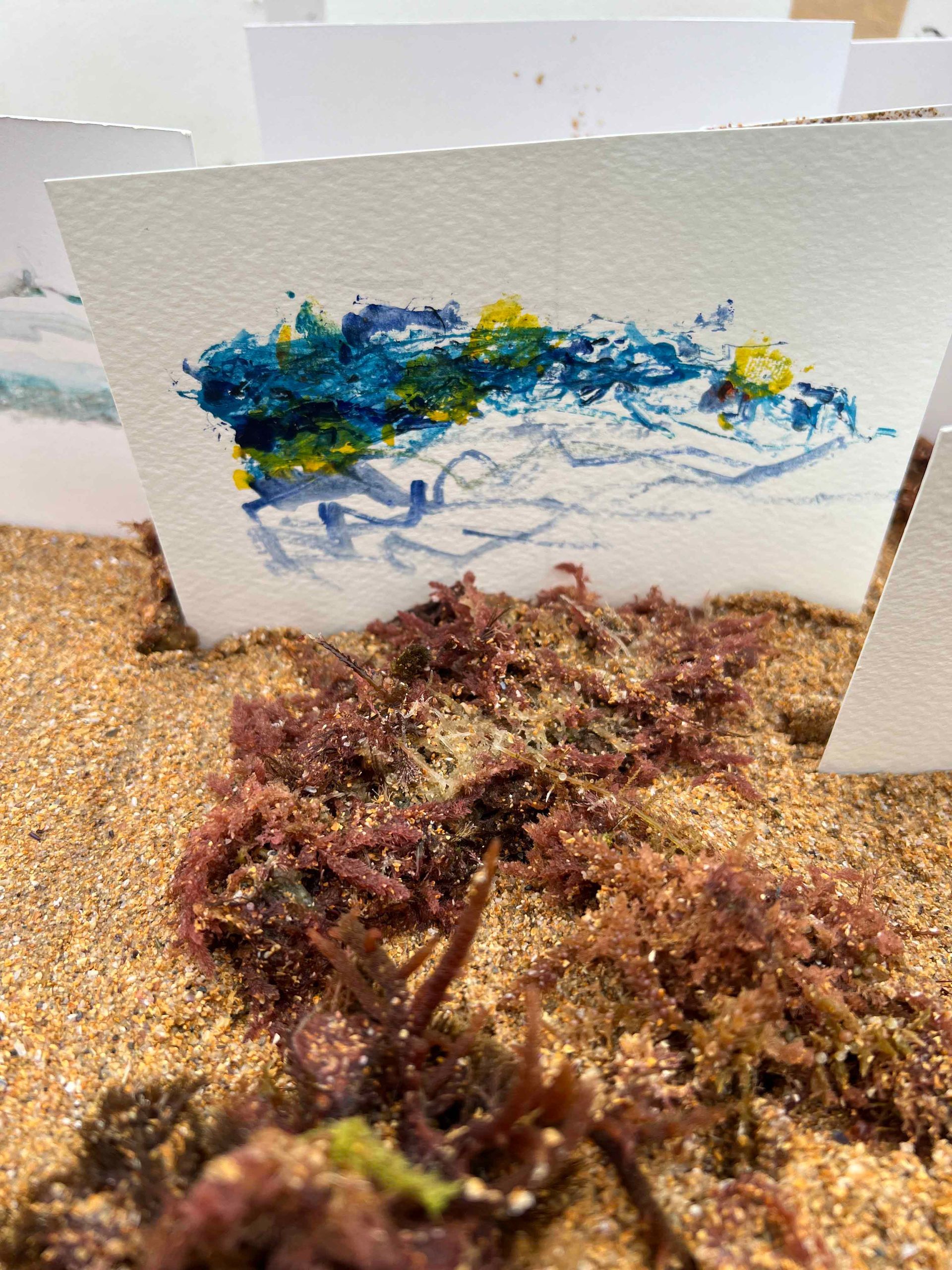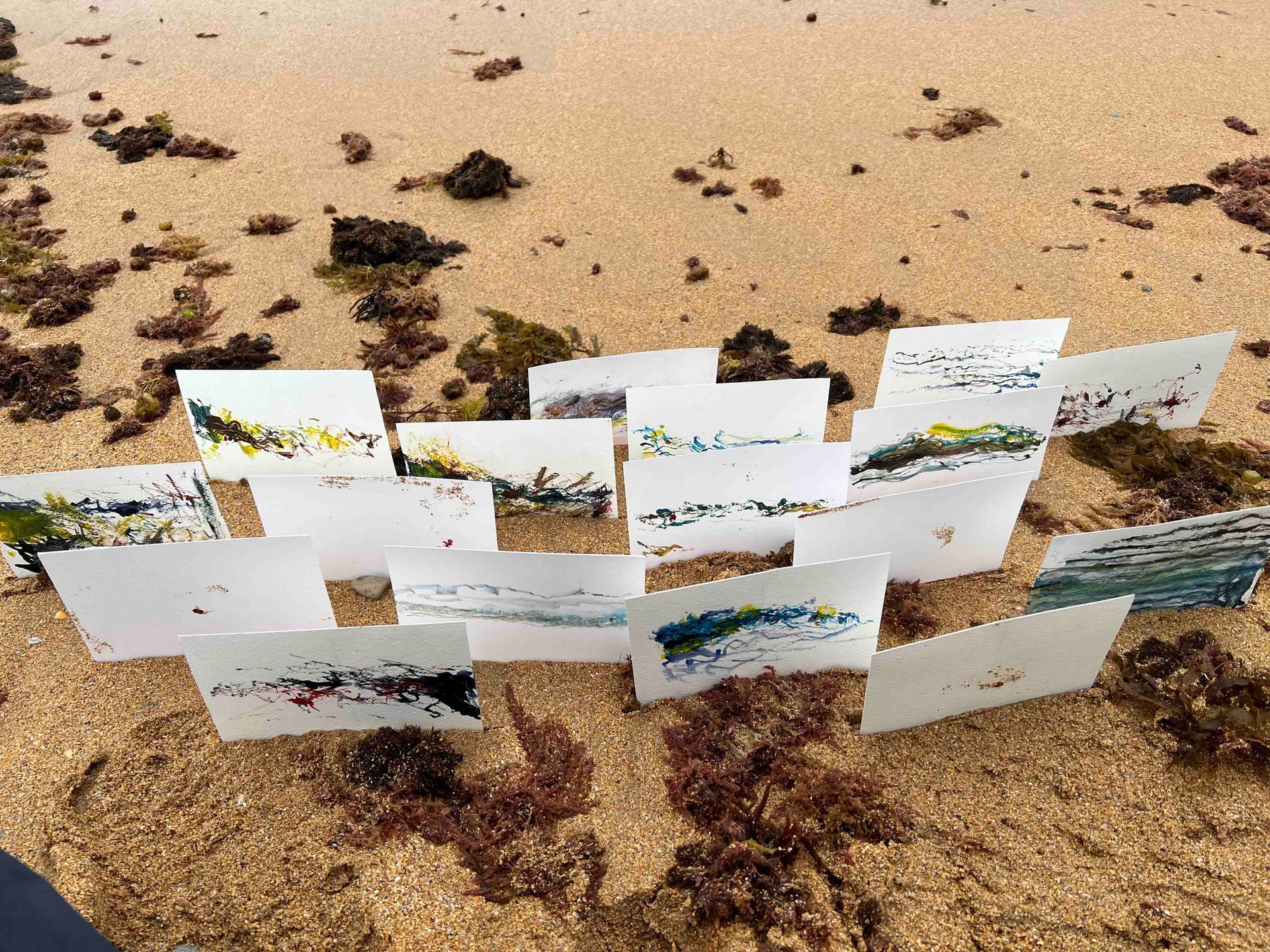 Mis obras capturan la esencia de las líneas ancestrales encontradas en las cuevas de Cantabria, fusionadas con la espontaneidad creada por la interacción con el mar. El arte impregnado por la historia grabada en la piedra se encuentra con la fluidez y la transformación que solo el agua de mar puede proporcionar, creando una experiencia visual que conecta el pasado con el presente, invitando al espectador a sumergirse en un viaje emocional y sensorial.