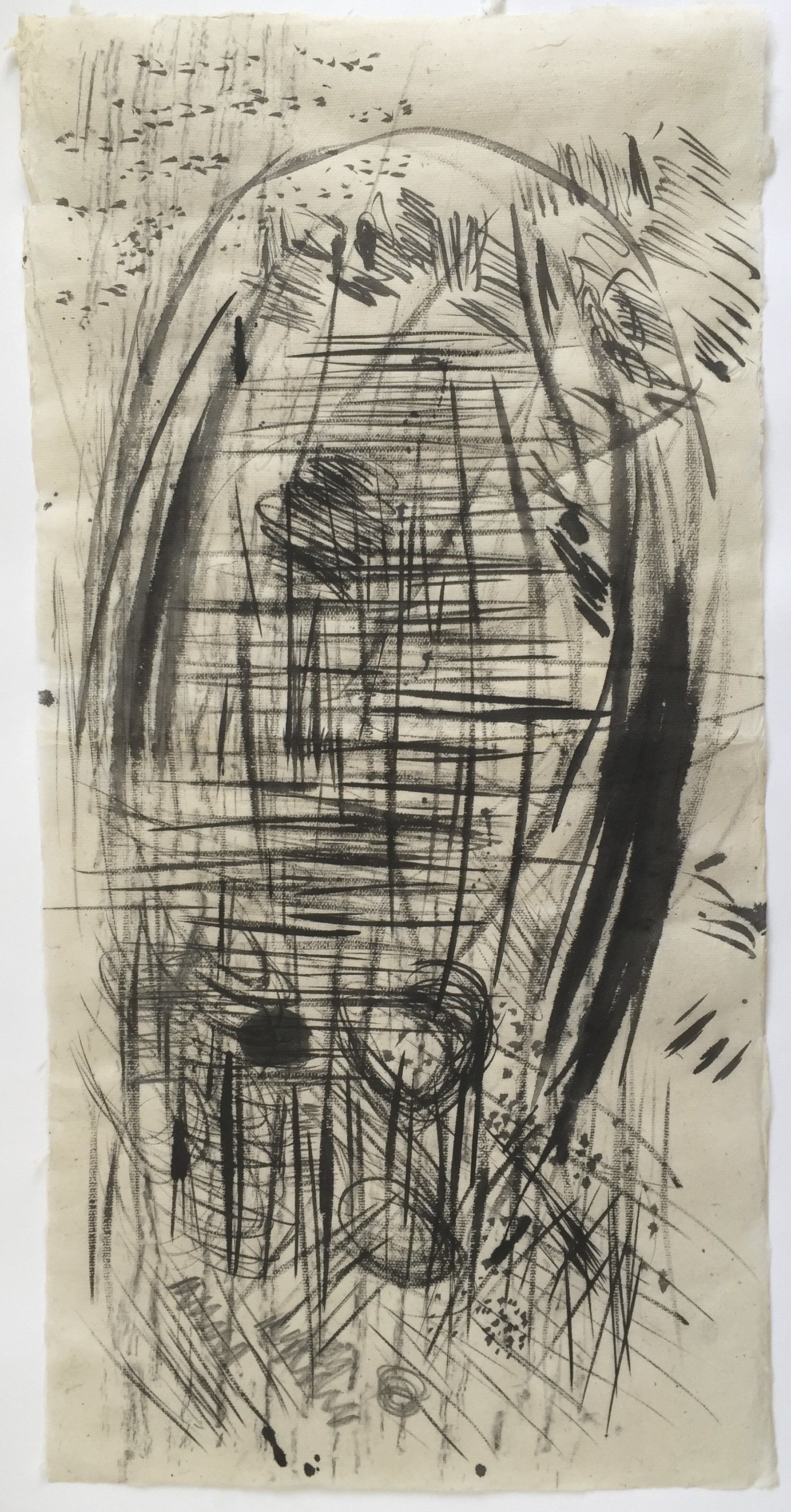 En mi proceso reciente basado en trabajos sobre papel, seda y lienzo trabajo principalmente con materiales naturales como algas, agua, arena, tierra, grafito, tinta china y piedra.