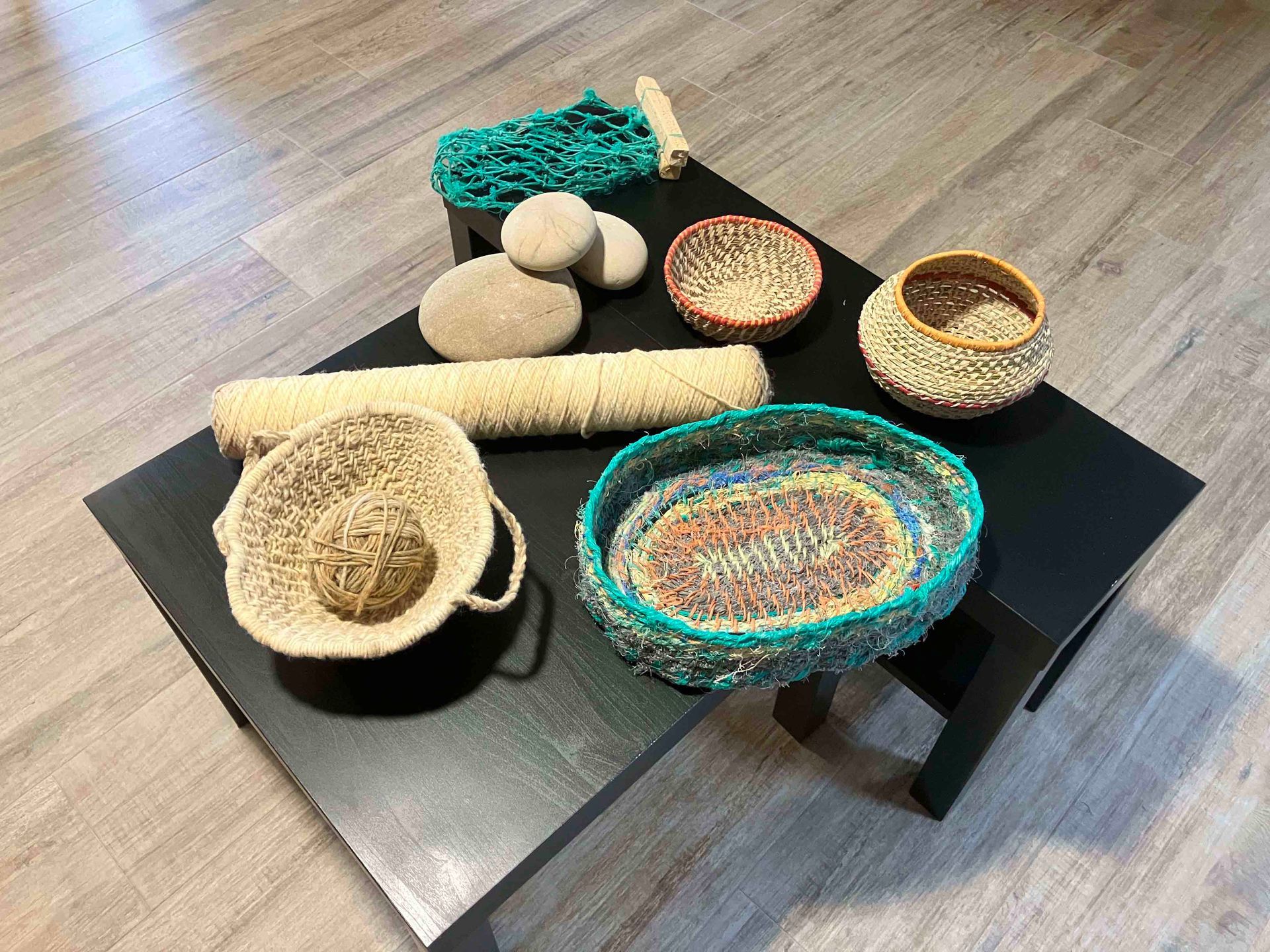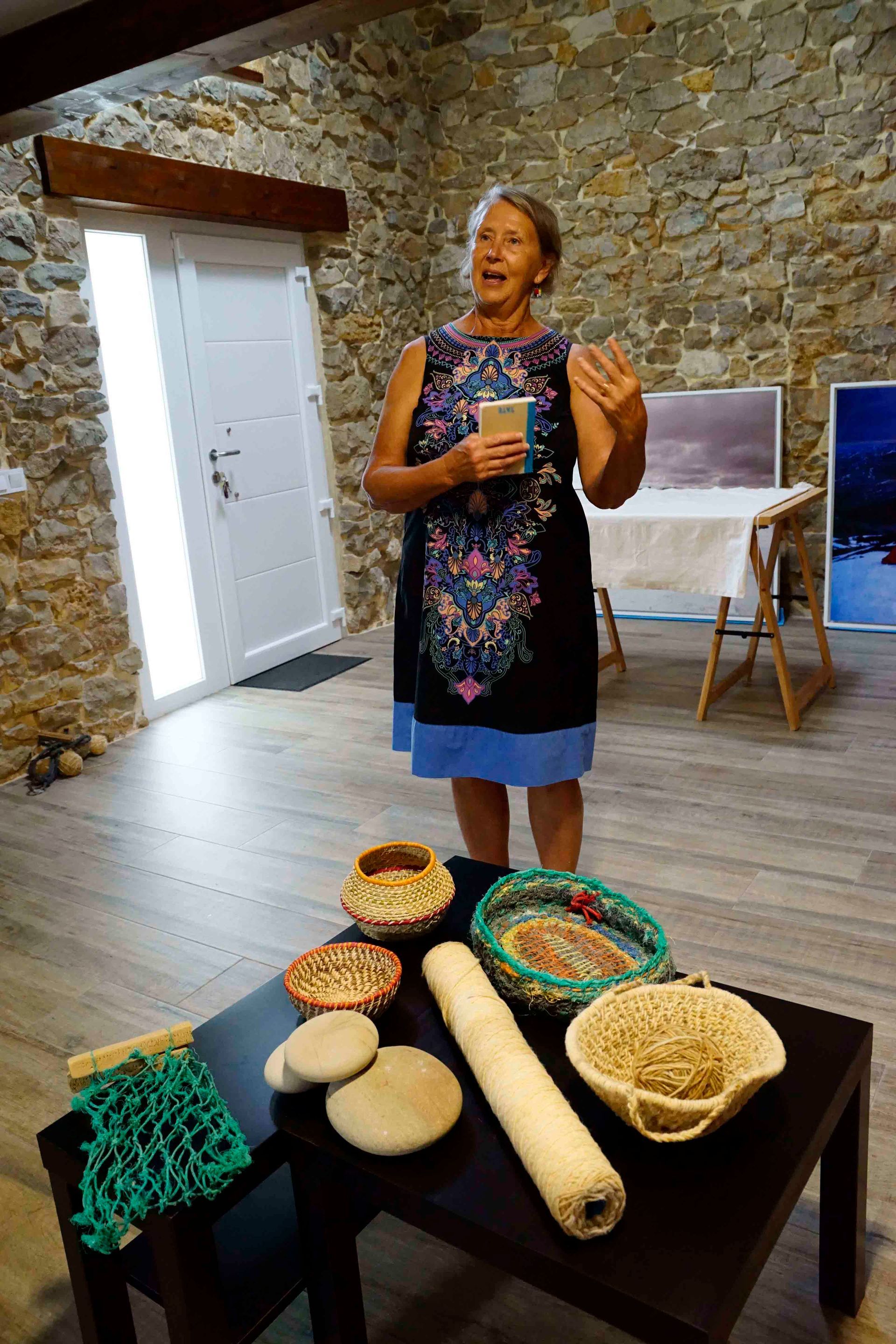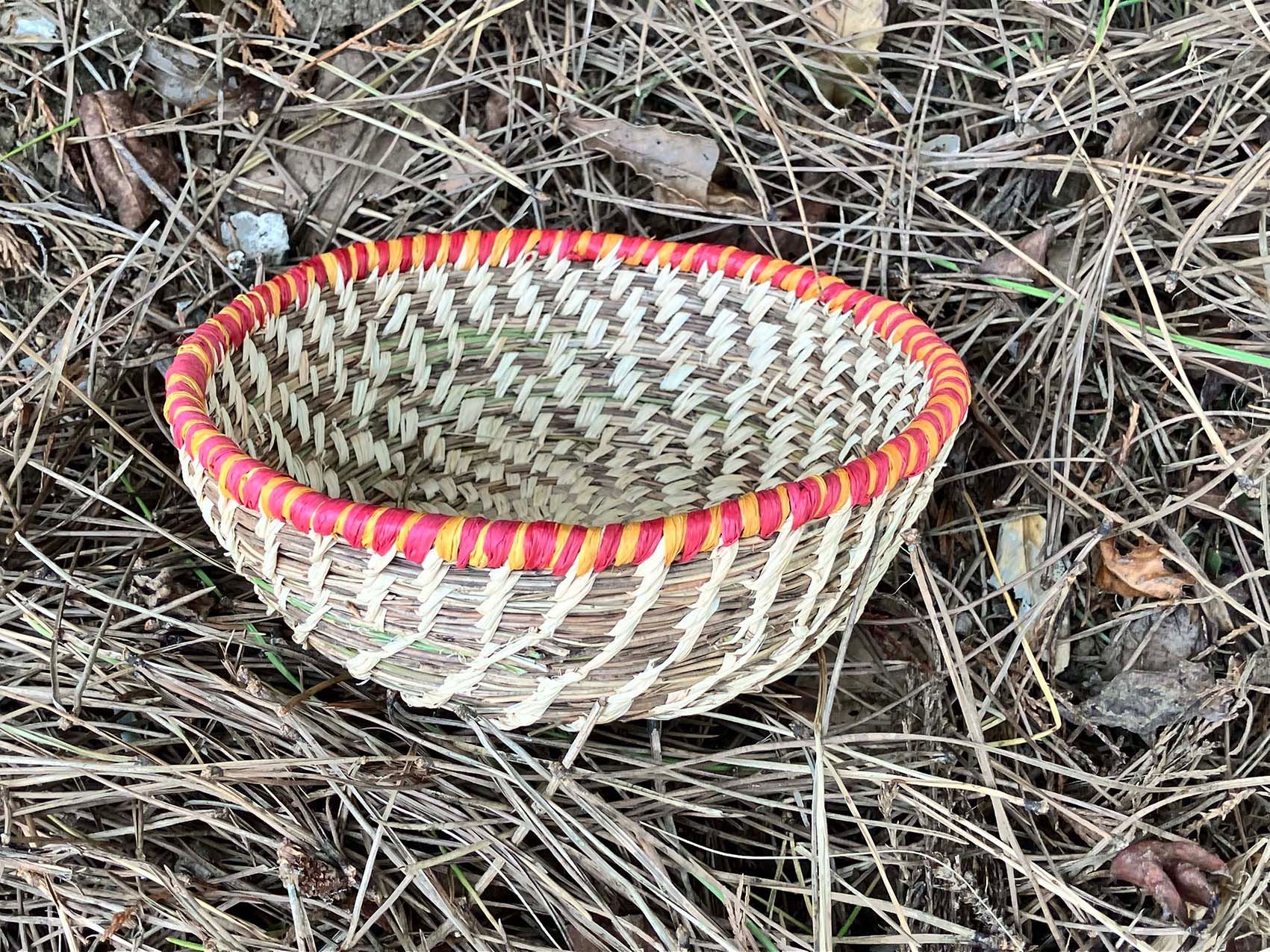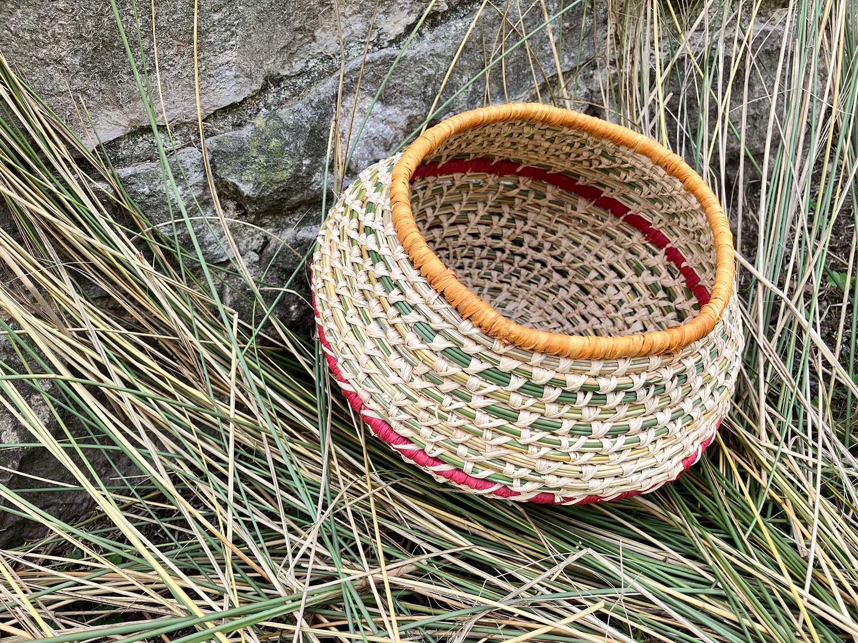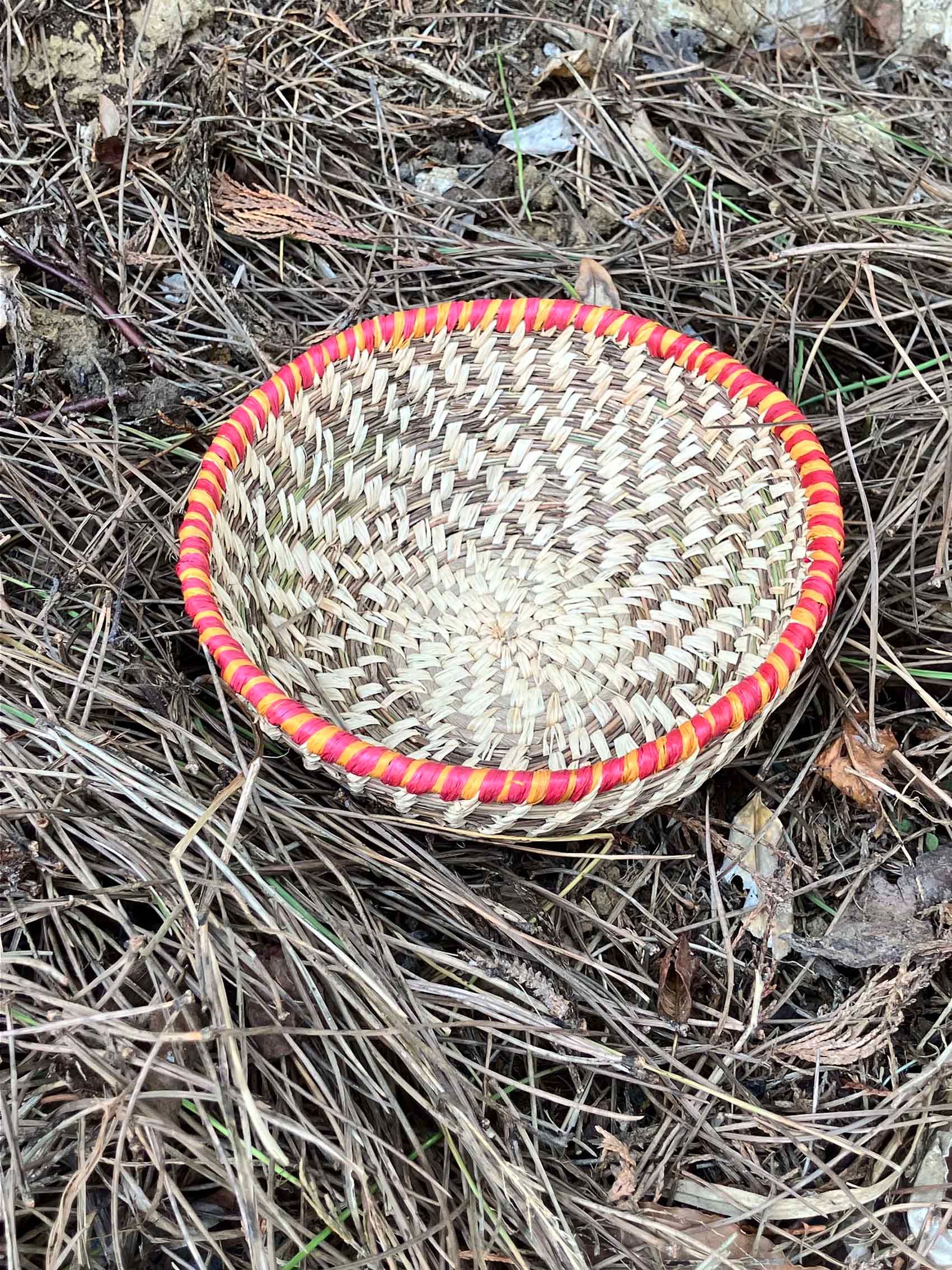 De camino a casa, recogí agujas de pino caídas para tejer un cuenco. Aprendí que el carbón vegetal utilizado en las pinturas rupestres prehistóricas se elaboraba exclusivamente con madera de pino: mi segundo contacto con aquellos primeros artistas. Trabajar con las agujas cortas fue un reto, pero me pareció una extensión natural de mi exploración. Así nació mi proyecto: crear recipientes utilizando materiales recogidos de la naturaleza —algunos orgánicos, otros desechos— para reflejar la tensión entre la belleza, la creatividad y las consecuencias de nuestro consumo.