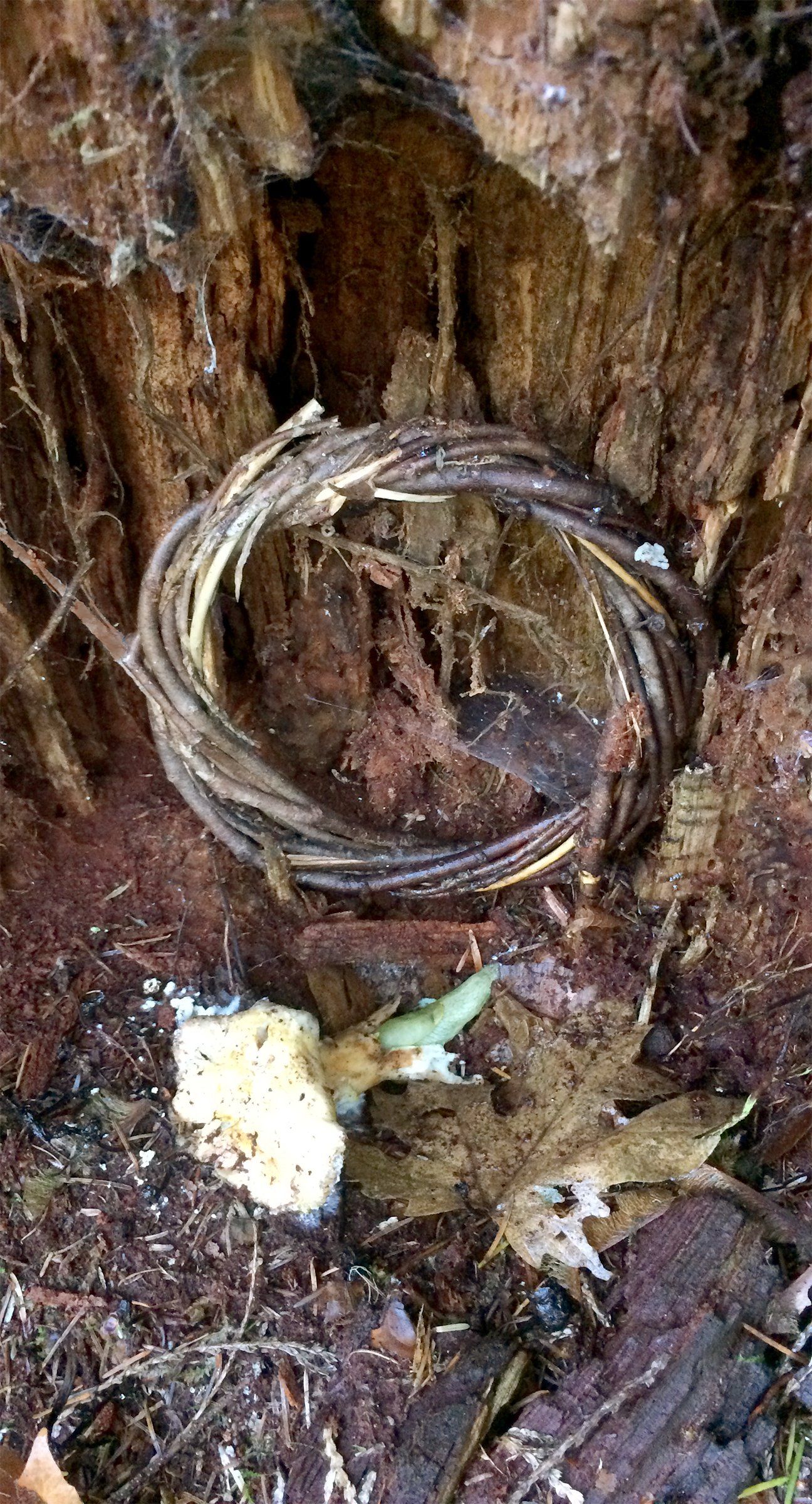 Encontré un lugar en el bosque y me estaba esperando. Ahora voy y le ofrezco cosas sencillas, pero con un sentido. Intento venerarlo y a la vez descubrirme en este espacio. Poco a poco me voy quitando las capas de lo que creo que soy, tanta carga que traigo. No sé qué va a pasar, pero espero pacientemente y disfruto el tiempo que paso ahí. Es como si fuera a visitar a un amigo; el amigo más abierto y mágico que jamás haya tenido.