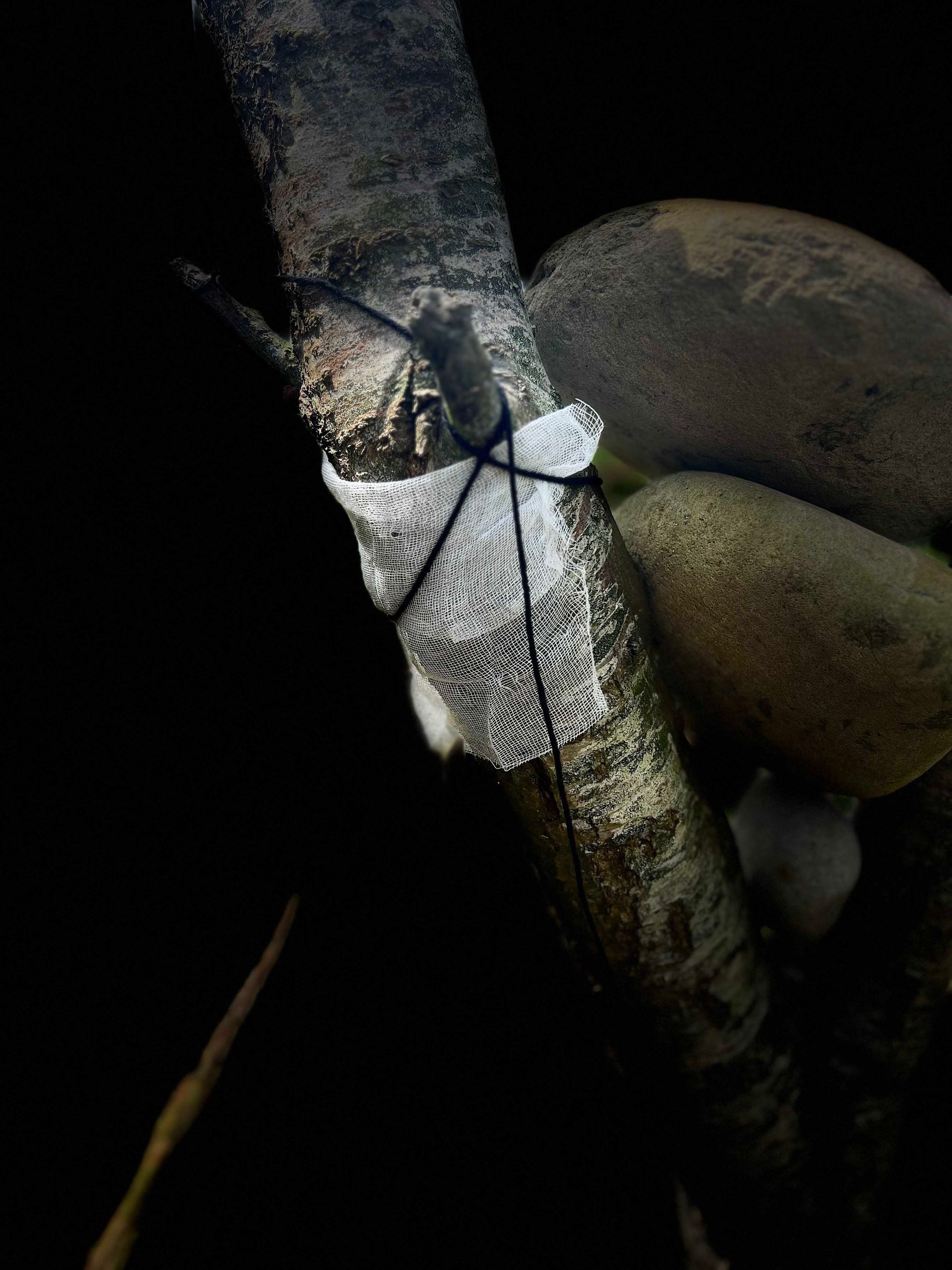 Como una suerte de hilo conductor de sanación, las cuerdas que los unen prodigan emociones; representadas por varios objetos hallados en el camino y que a modo de ritual sagrado, honran la memoria ancestral de la Tierra.