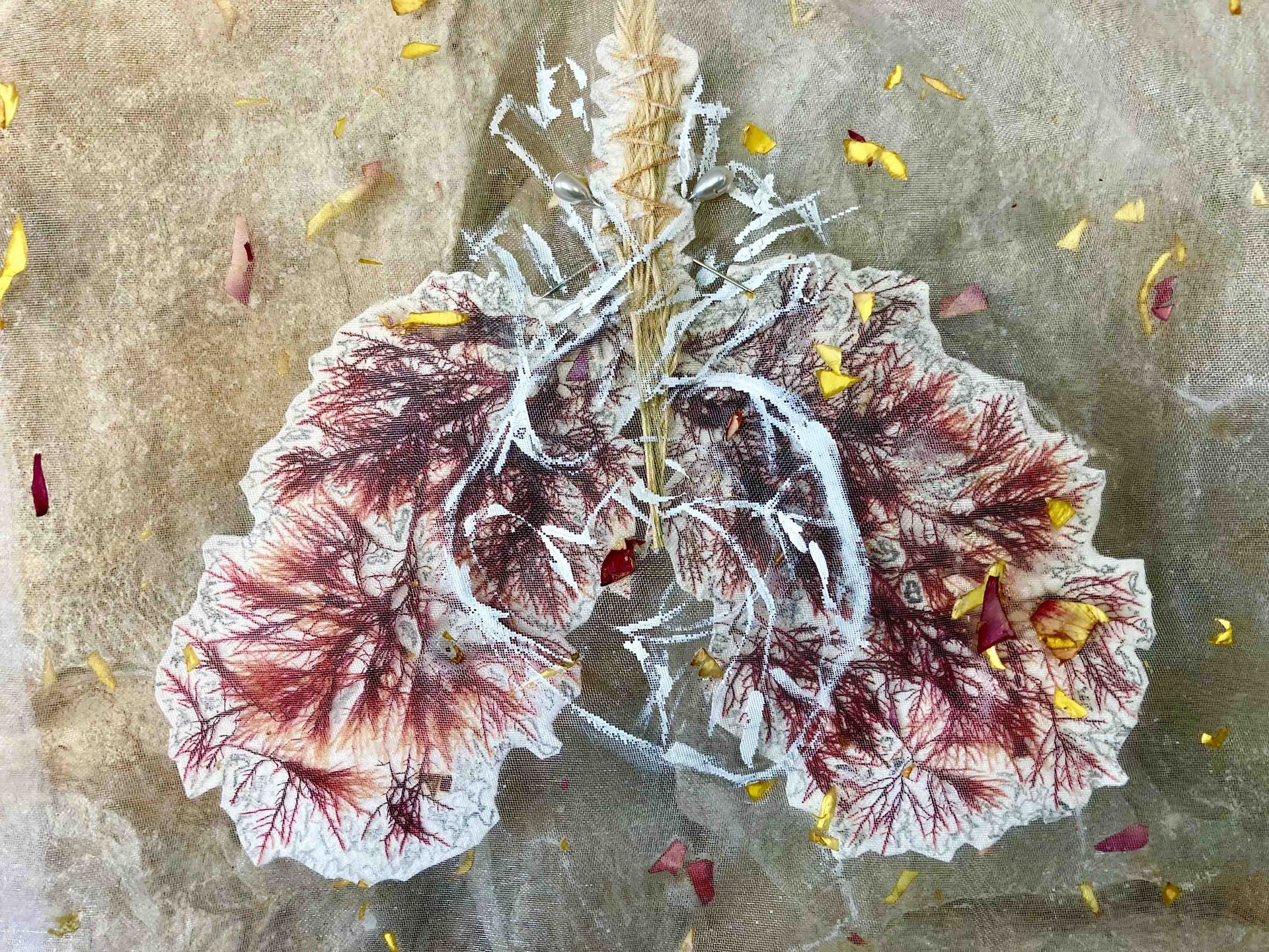 “Once out of the cocoon, I spread my wings and take flight. I play and laugh in pleasant and nourishing company and marvel at the beauty of a calm and inspiring landscape. I feel the blood rushing through my veins and oxygen filling my lungs thanks to the clean, fresh air I breathe. I paint with flowers and seaweed in a literal state of intoxication, on account of the wine, the well-being and the pleasure of being able to create, without realizing it, from the principles of Ikebana and Kintsugi, composing the work from what I feel.