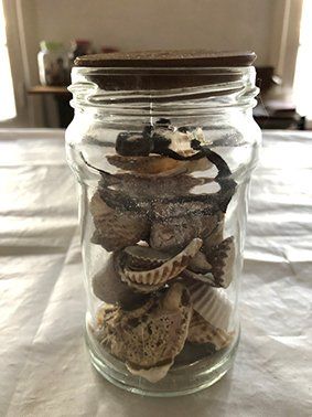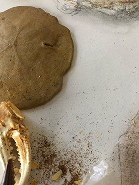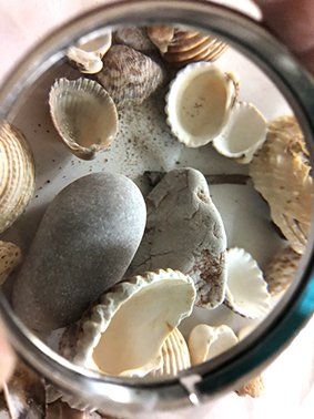 The AIR reflections WATER. The WIND when it caresses my skin. The Cobalt BLUE SKY. The LIGHT of the SUN its brilliance and color. The water wetting my feet on the beach...So many times so many beaches walked, I need to walk on more. It is always a pleasure to be in them...the vastness of the landscape ... the distant horizons... Living beings...seashells... bugs ... move around the world ...north... south... center... east... west ... They were the first emotions after listening the origins of man in the Altamira Caves. When I'm in nature I borrow some items ... stones, earth, seashells, leaves, feathers when I get home I keep them in jars in bags or translucent envelopes are my treasure my precious stones... They have traveled, through many place they come... they go...leading me to feel the most essential... I still haven't opened the jars. I opened the box of cactus wood from the north of Argentina, I find many bags and a small transparent envelope with the bark of a tree, it looks like an earring because of its filigree, mother-of-pearl seashells, crab legs, beautiful because of its color and texture. Why did store them in transparent bags and envelopes? For care... protection... classification...