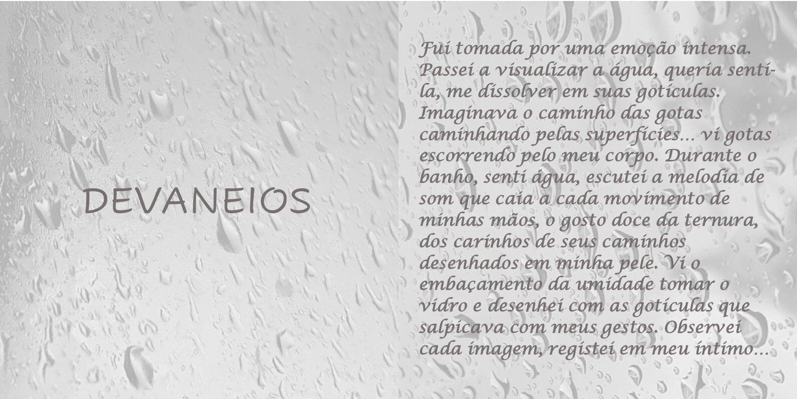 Fui tomada por uma emoção intensa. Passei a visualizar a água, queria senti-la, me dissolver em suas gotículas. Imaginava o caminho das gotas caminhando pelas superfícies... vi gotas escorrendo pelo meu corpo. Durante o banho, senti água, escutei a melodia de som que caia a cada movimento de minhas mãos, o gosto doce da ternura, dos carinhos de seus caminhos desenhados em minha pele. Vi o embaçamento da umidade tomar o vidro e desenhei com as gotículas que salpicava com meus gestos. Observei cada imagem, registei em meu íntimo...