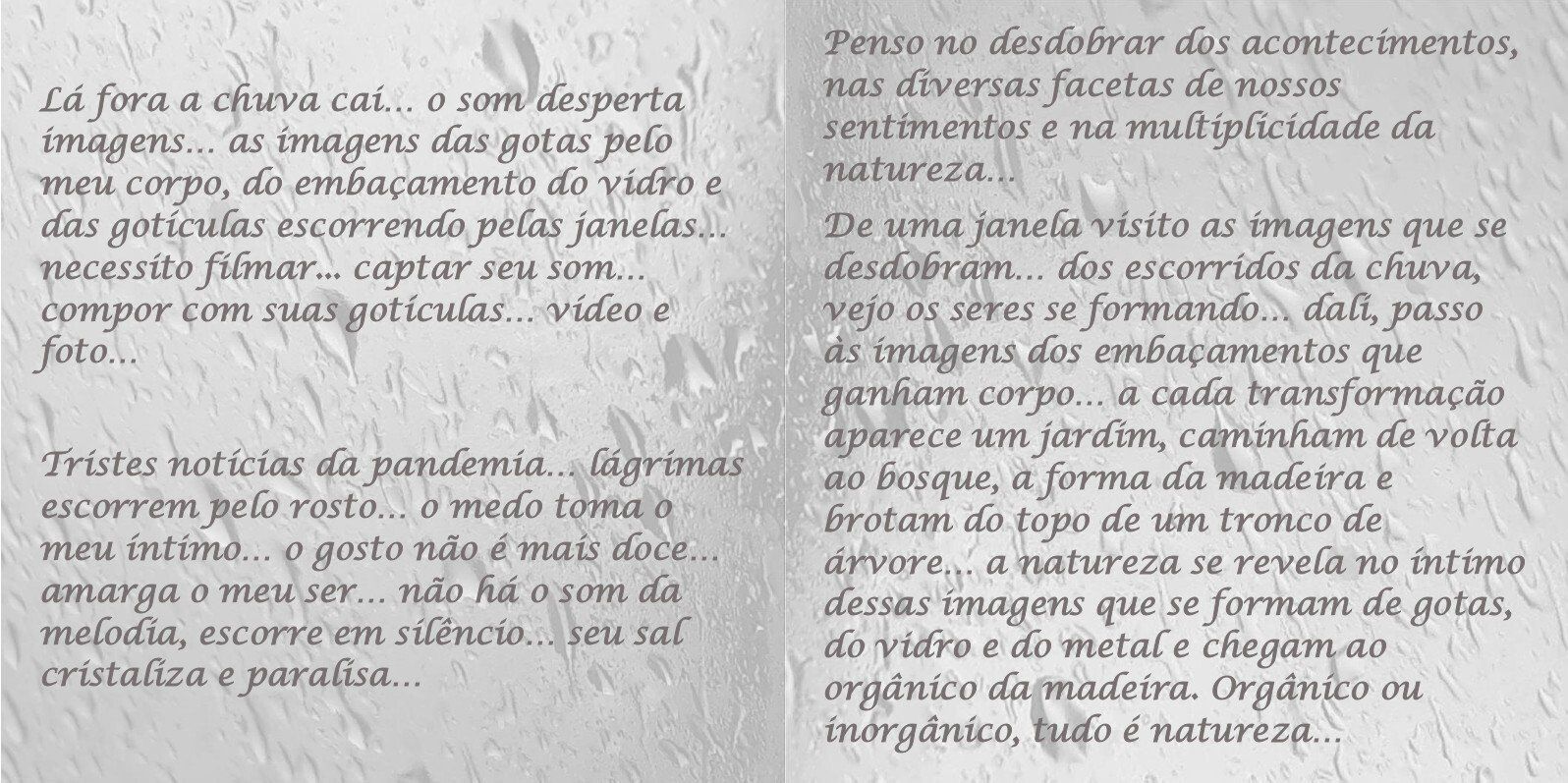 De uma janela visito as imagens que se desdobram... dos escorridos da chuva, vejo os seres se formando... dali, passo às imagens dos embaçamentos que ganham corpo... a cada transformação aparece um jardim, caminham de volta ao bosque, a forma da madeira e brotam do topo de um tronco de árvore... a natureza se revela no íntimo dessas imagens que se formam de gotas, do vidro e do metal e chegam ao orgânico da madeira. Orgânico ou inorgânico, tudo é natureza...
