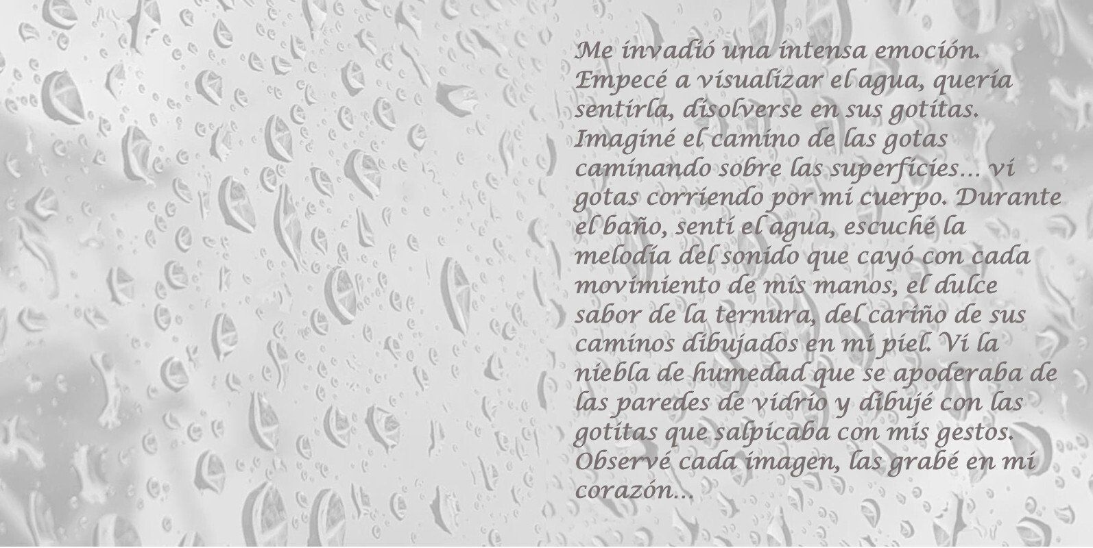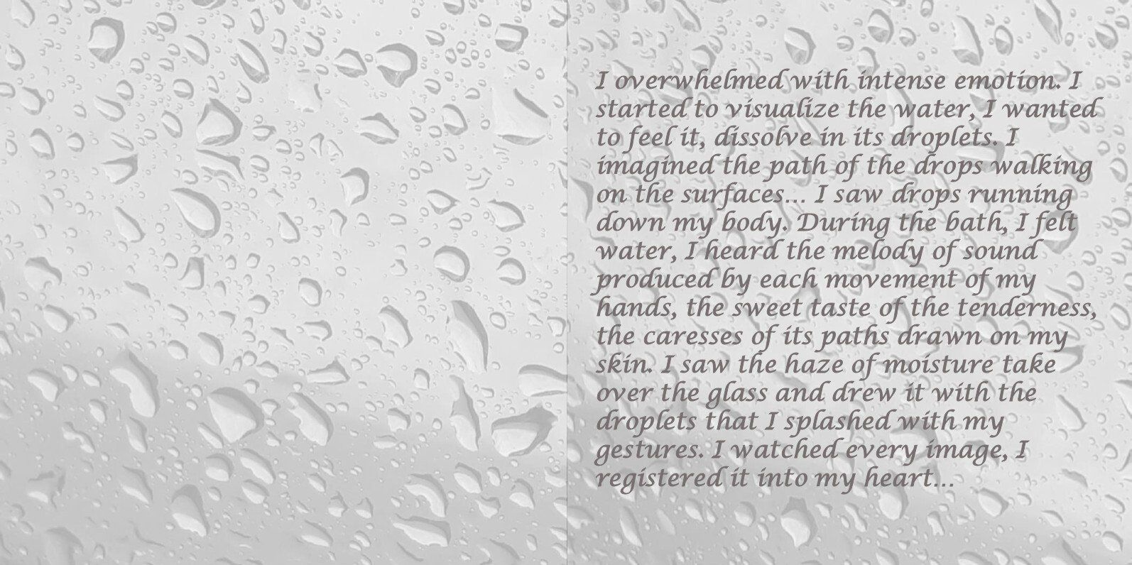 I was overwhelmed with intense emotion. I started to visualize the water, I wanted to feel it, dissolve in its droplets. I imagined the path of the drops walking on the surfaces… I saw drops running down my body. During the bath, I felt water, I heard the melody of sound produced by each movement of my hands, the sweet taste of the tenderness, the caresses of its paths drawn on my skin. I saw the haze of moisture take over the glass and drew it with the droplets that I splashed with my gestures. I observed every image, I registered it into my heart…