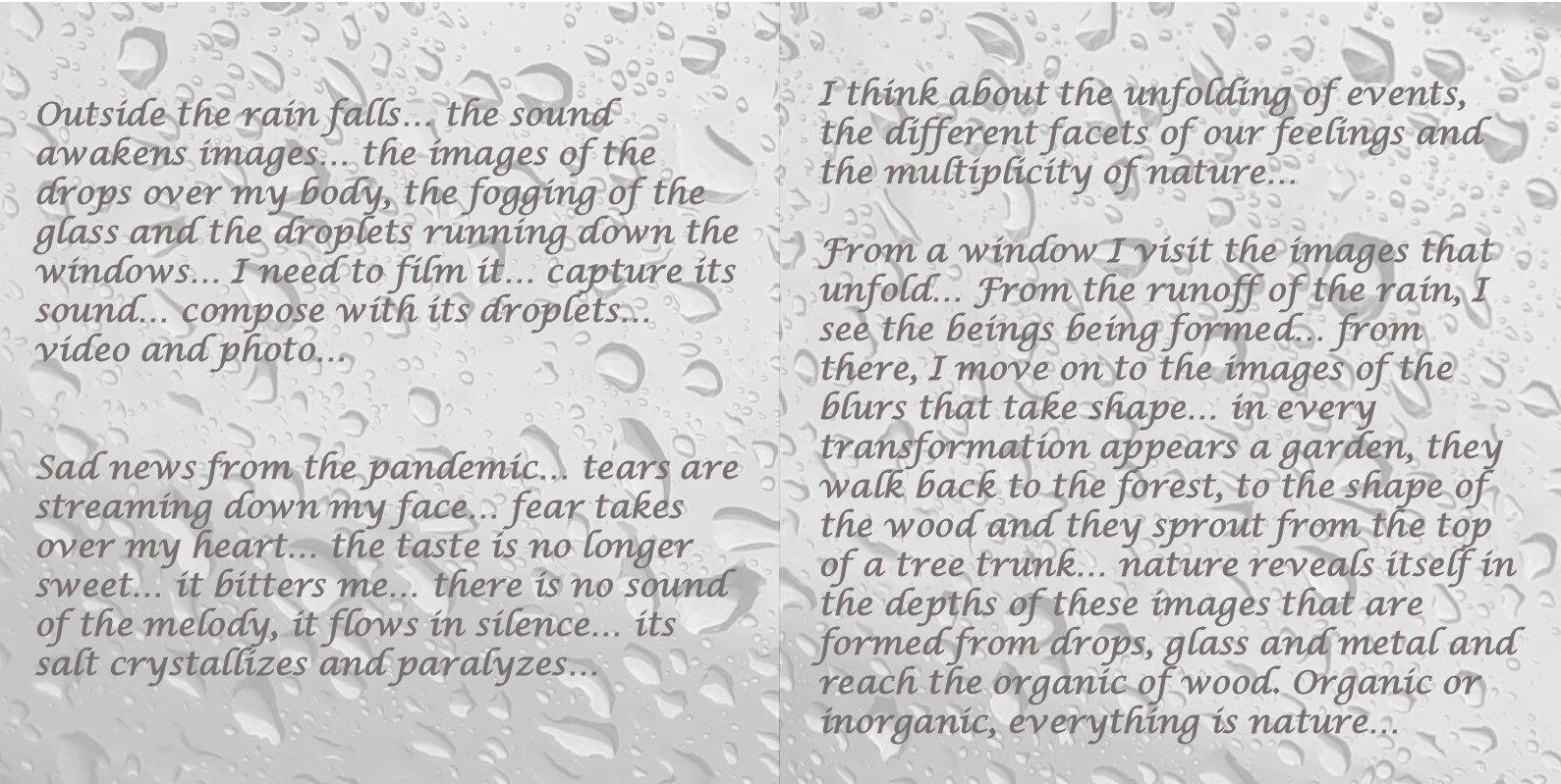 Outside the rain falls... the sound awakens images... the images of the drops over my body, the fogging of the glass and the droplets running down the windows... I need to film it... capture its sound... compose with its droplets... video and photo...