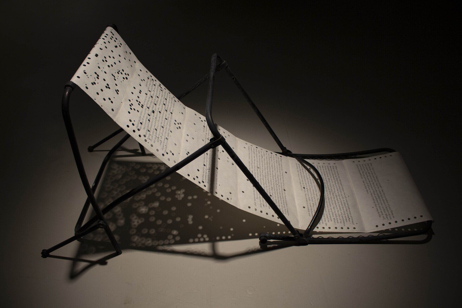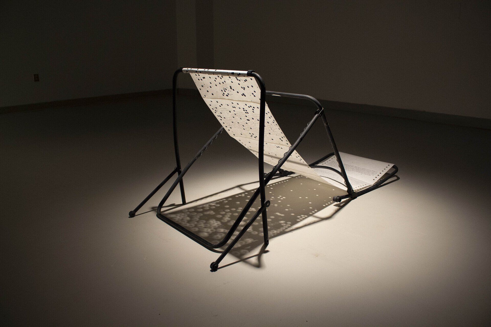When I touch you, I feel your breath. I feel the pulsation of your fibres as they flicker in the soft wind. I feel the subtle fluctuations in tension across your seams, left behind by fleshy bodies cradled on your surface. When I touch you, I feel the gentle texture of fibres, polluted by dust, sand, soil, and soot. The tiny grains roll off your surface making their way to the ground beneath you. I feel us lose them. When I touch your damaged edges, the soft, and delicate wisps of thread flutter across my fingertips almost too quickly to absorb their presence. I feel your cold metal frame and the bumps and divots from long winters outside in prairie storms. Still strong, it attempts to maintain any semblance of your purpose. When I touch you, I feel the pressure on the soles of my feet, as I rocked myself backward. When I touch you I feel my belly brace before sinking, briefly, like at the top of a rollercoaster, weightless.