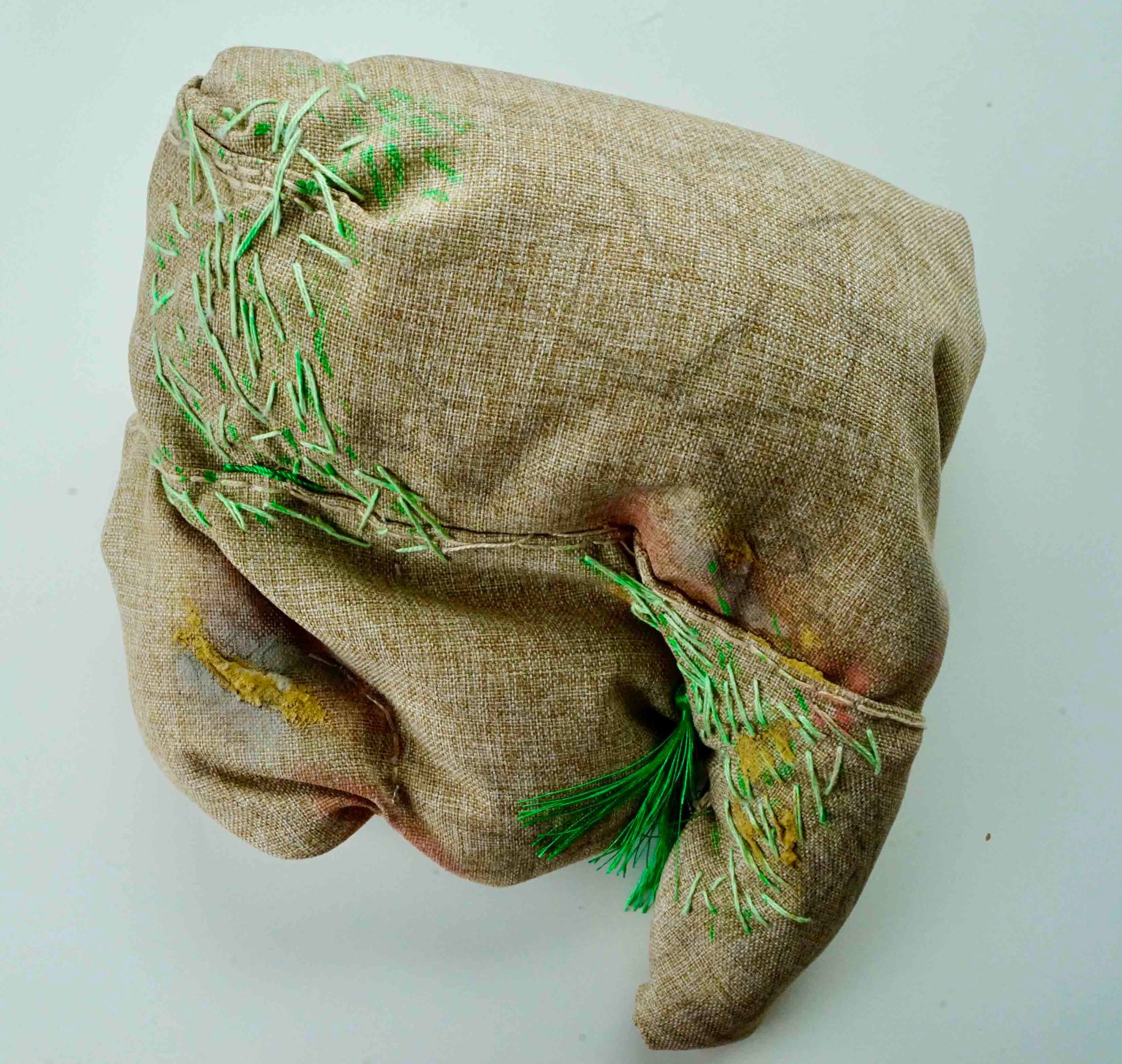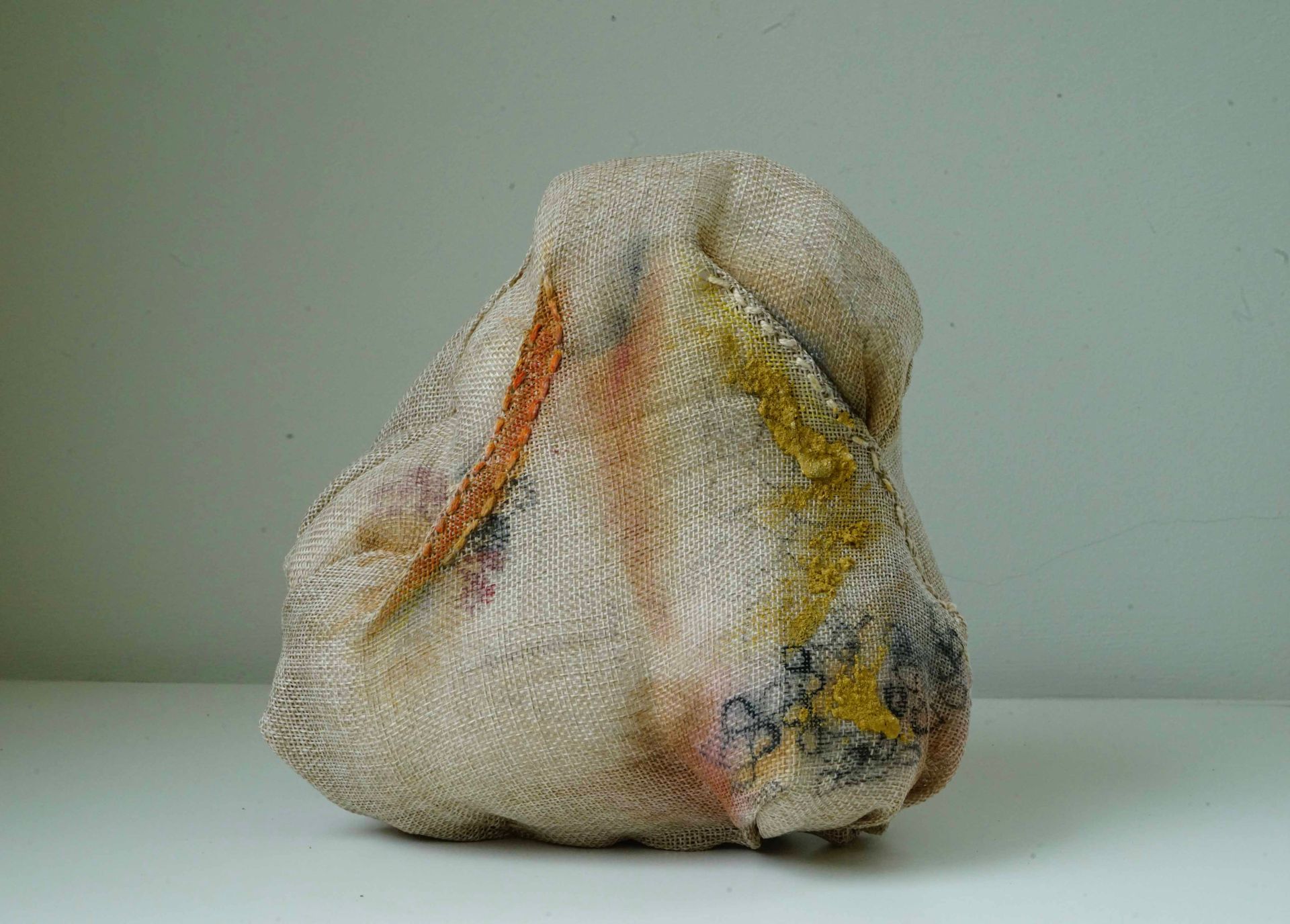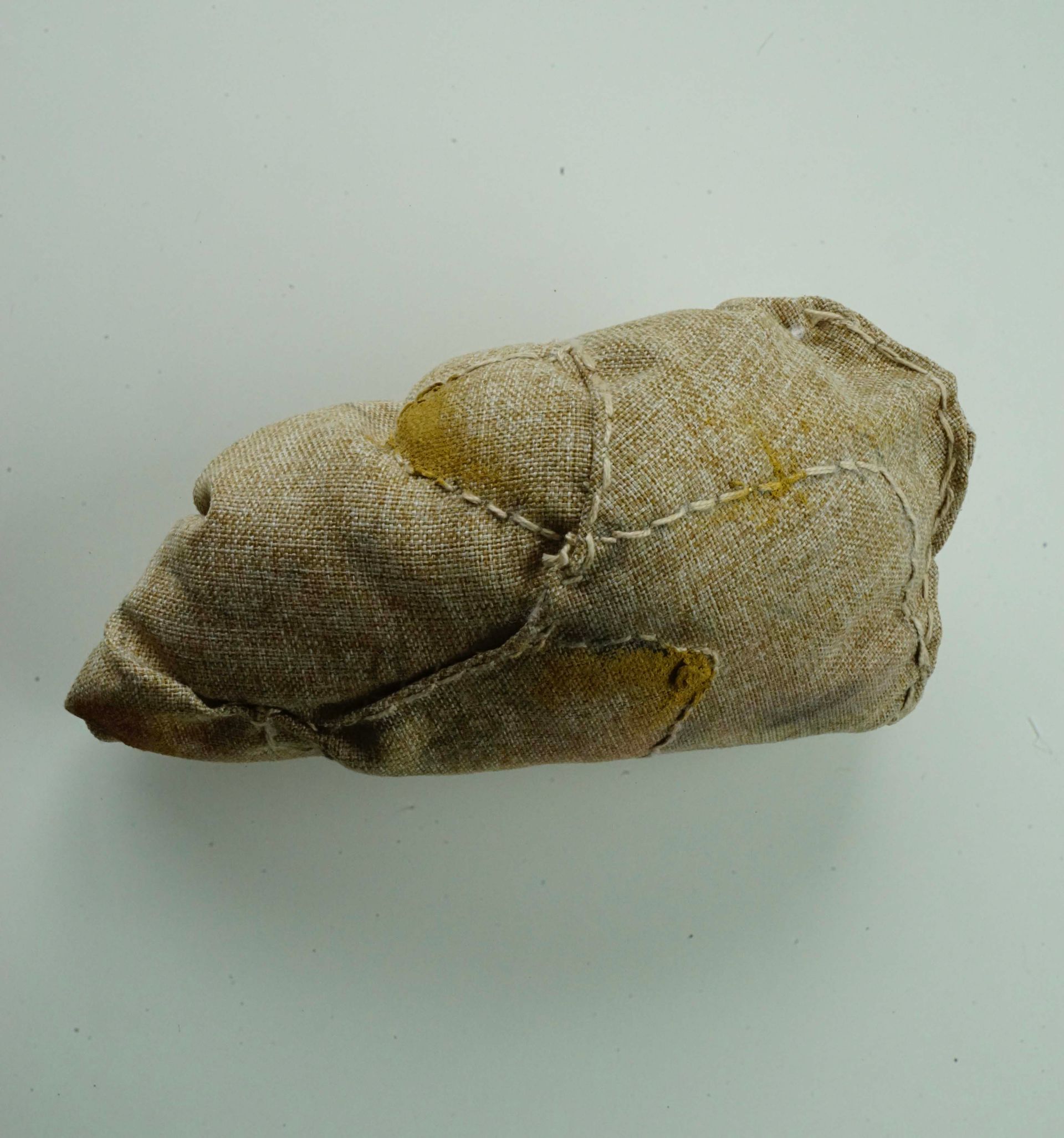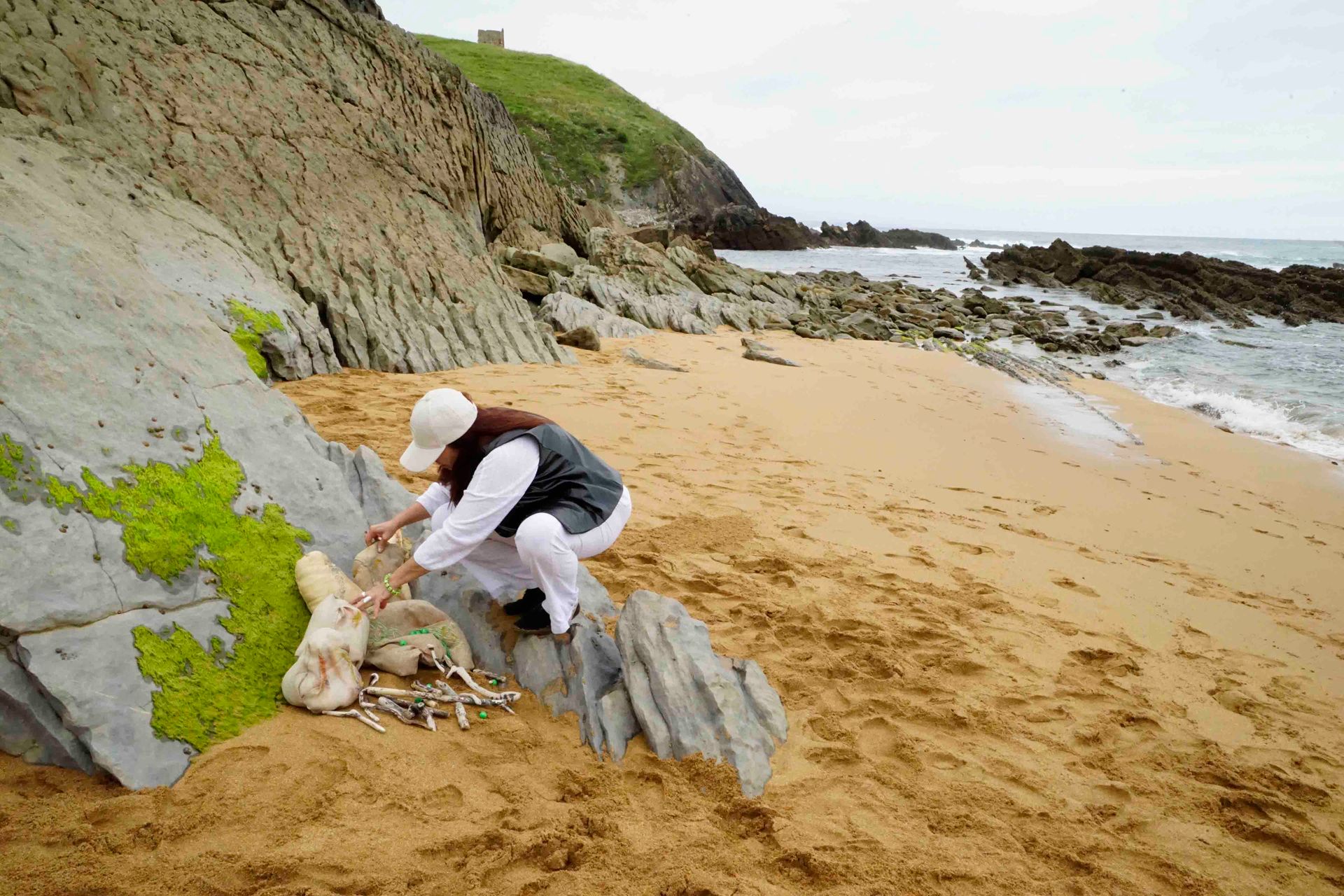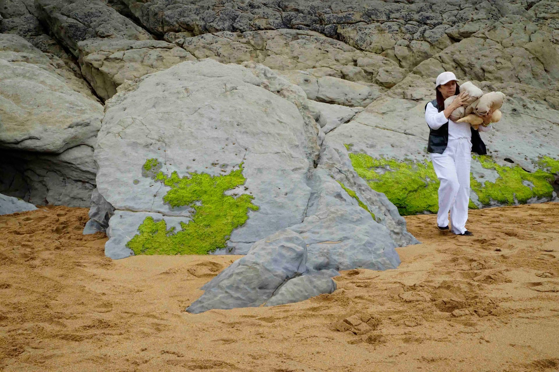 I studied the hours of the high tides and low tides, necessary to navigate my arrival to a large stone covered in lichens, lichens whose green color embody resilience and adaptability, and connect me with the living beings that we are. This is how I see my objects, each bestowed with the vestige of the land where homo sapiens, Neanderthals, lived. And this is how I feel cushioned, sensitive, spiritual. Arranging my objects one by one, the scene takes shape as I embroider it, with the belief that the sea shall leave it be.