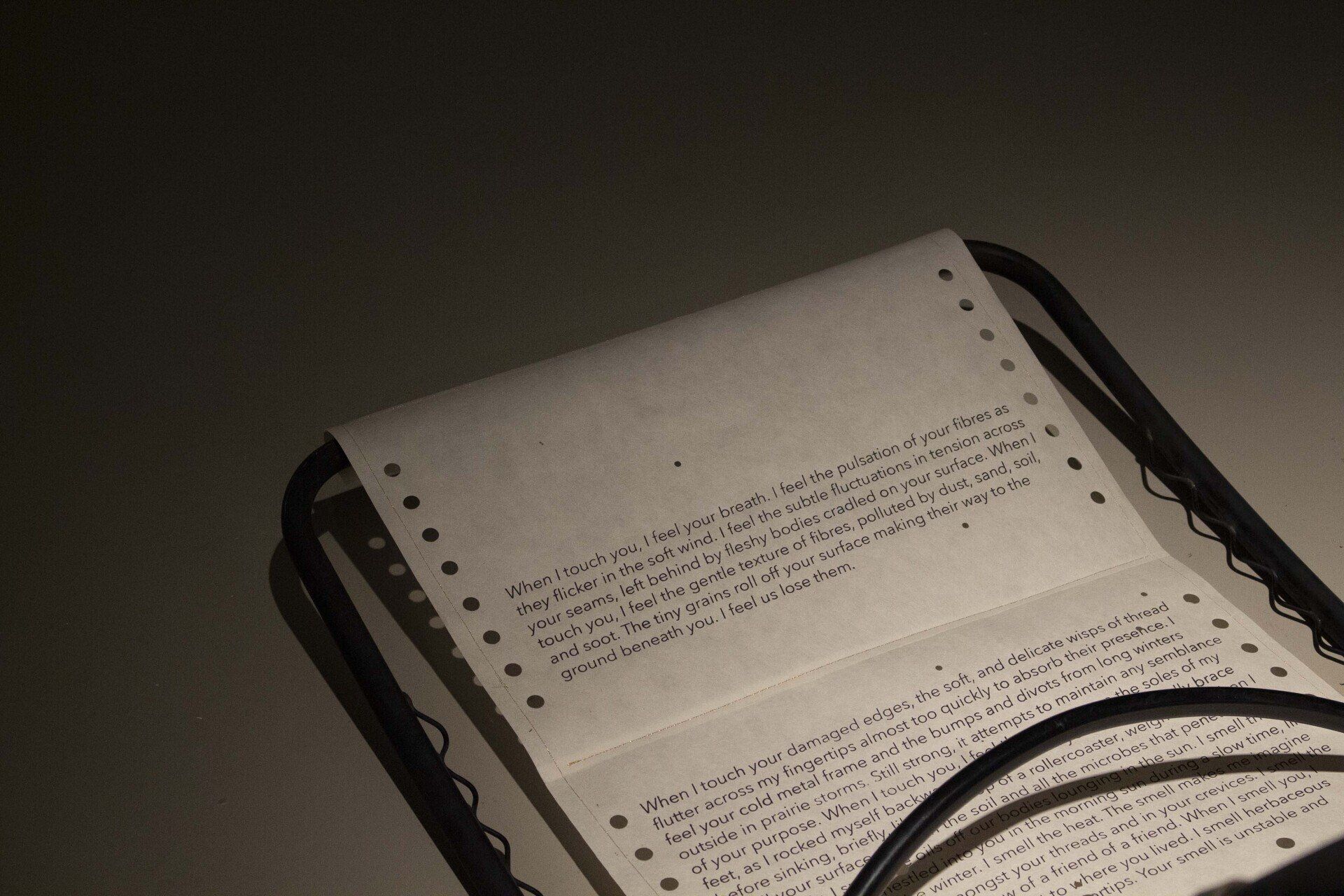 Cuando huelo tu superficie, respiro la tierra y todos los microbios que penetran en tu cuerpo. Huelo los aceites de nuestros cuerpos descansando al sol. Huelo el libro que leí mientras me acurrucaba en ti bajo el sol de la mañana durante un tiempo lento, como ningún otro. Huelo el invierno. Huelo el calor. El olor me hace imaginar las redes activas entre tus hilos y en tus hendiduras. Huelo la cerveza barata y la saliva de un amigo de un amigo. Cuando te huelo, huelo la hierba que creció junto a donde vivías. Huelo especias herbáceas que se absorben en las yemas de mis dedos. Tu olor es inestable y dinámico, como muchos que te han sentido. Cuando te huelo, me imagino las otras formas en que has olido. Me imagino que oliste a algo nuevo, químico y sanitario saliendo de una caja. Cuando te huelo, me imagino la vida que viviste antes de mi, en una estantería, en una tienda, en producción. Me imagino las manos que te han tocado, que te han hecho. Me imagino la agitación de los recursos de nuestras tierras, mares y suelos, que me han permitido olerte.