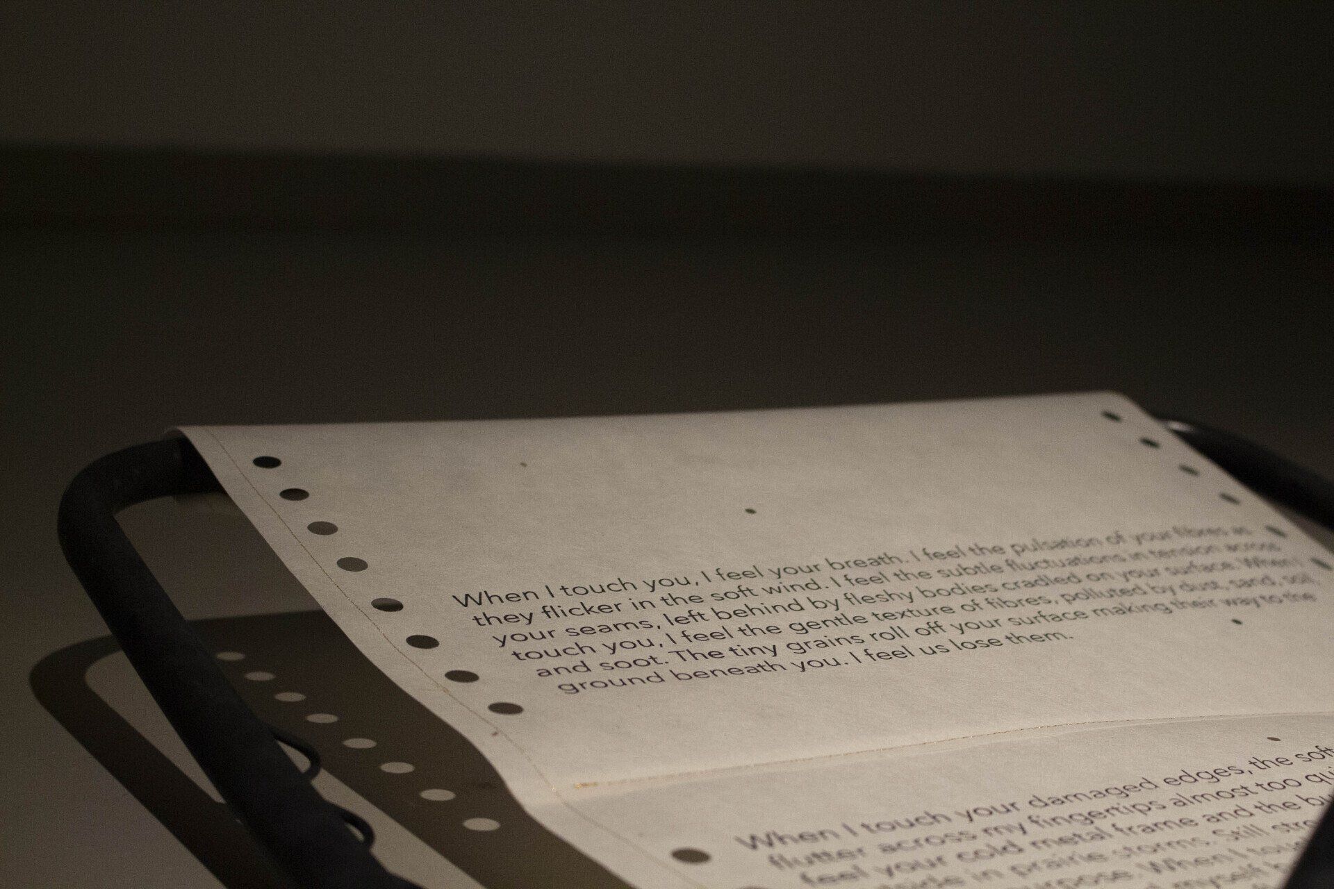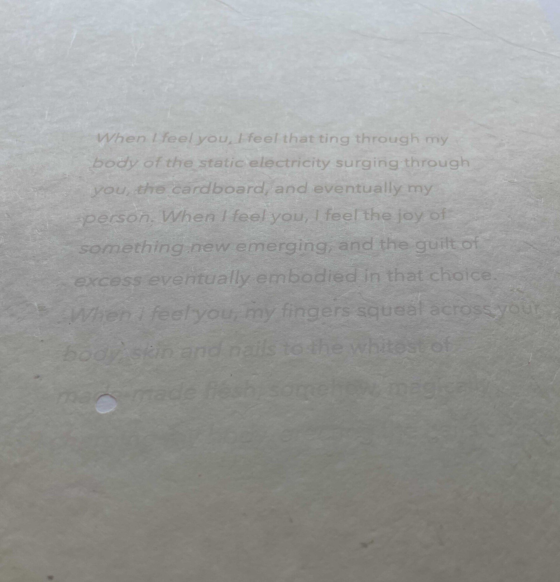 Cuando te sentí por primera vez, mis dedos presionaron tu superficie, aplanando los pequeños nudos que forman tu cuerpo con mis dedos apretados. Cuando te siento, siento la anticipación de pasarte, de poder sostener cualquier cosa nueva, brillante y de plástico que haya comprado. Cuando te siento, siento ese cosquilleo a través de mi cuerpo de la electricidad estática que fluye a través de ti, el cartón y, finalmente, mi persona. Cuando te siento, siento la alegría de que algo nuevo emerge, y la culpa del exceso eventualmente encarnada en esa elección. Cuando te siento, mis dedos chillan a través de tu cuerpo, piel y uñas hasta la más blanca de la carne hecha, de alguna manera, cargando mágicamente mi cuerpo, erigiendo los pelos de mis brazos.