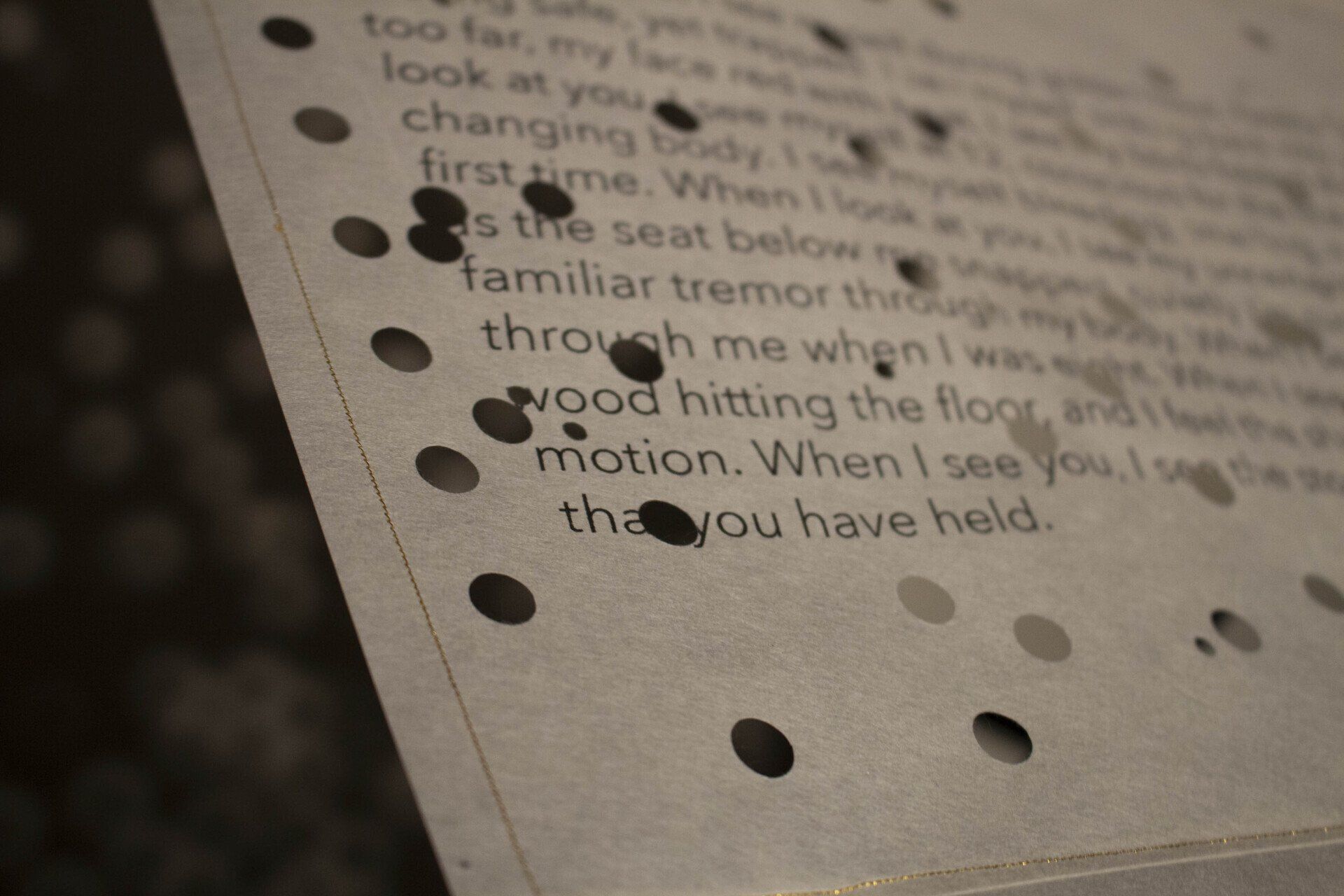 Cuando te veo, me veo durante la hora dorada, arrojándome apresuradamente sobre ti, sintiéndome segura, pero atrapada. Me veo hundiéndome de nuevo en ti antes de hundirme demasiado, mi cara enrojecida por el calor. Veo mi cuerpo atravesado por ti. Cuando te miro, me veo a mí misma a los 12 años, consciente por primera vez de mi cuerpo en rápido cambio. Me veo sangrando, oliendo y sudando de verdad por primera vez. Cuando te miro, veo mi incertidumbre y siento que mi corazón se acelera cuando el asiento debajo de mí se rompe, en silencio, estoy segura, pero lo suficientemente fuerte como para enviar un temblor familiar a través de mi cuerpo. Cuando te veo, siento el pellizco que me atravesó cuando tenía ocho años. Cuando te veo, escucho el sonido de la madera golpeando el piso, y siento la vergüenza crecer dentro de mí, mientras caigo en cámara lenta. Cuando te veo, veo las historias que encarnas y los cuerpos que has sostenido.