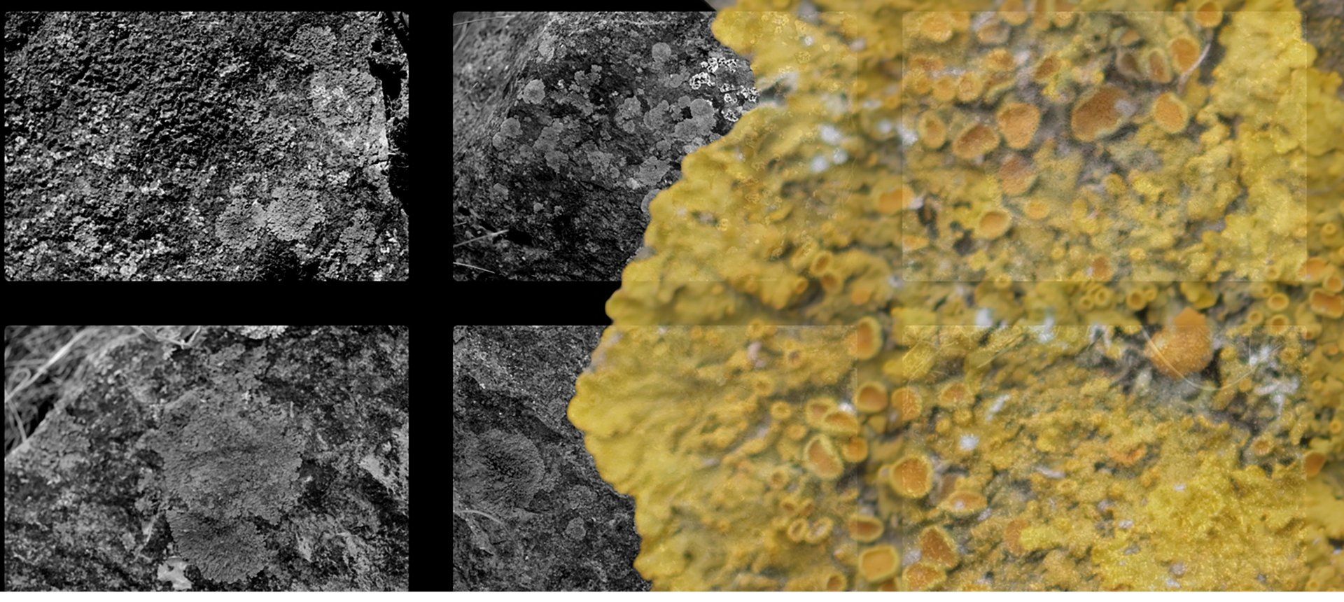 Manchas aleatorias de seres minúsculos inscribiendo trazos en la superficie. Cada hongo deviene un cosmos, se enlaza con otros formando un universo sin jerarquías.
