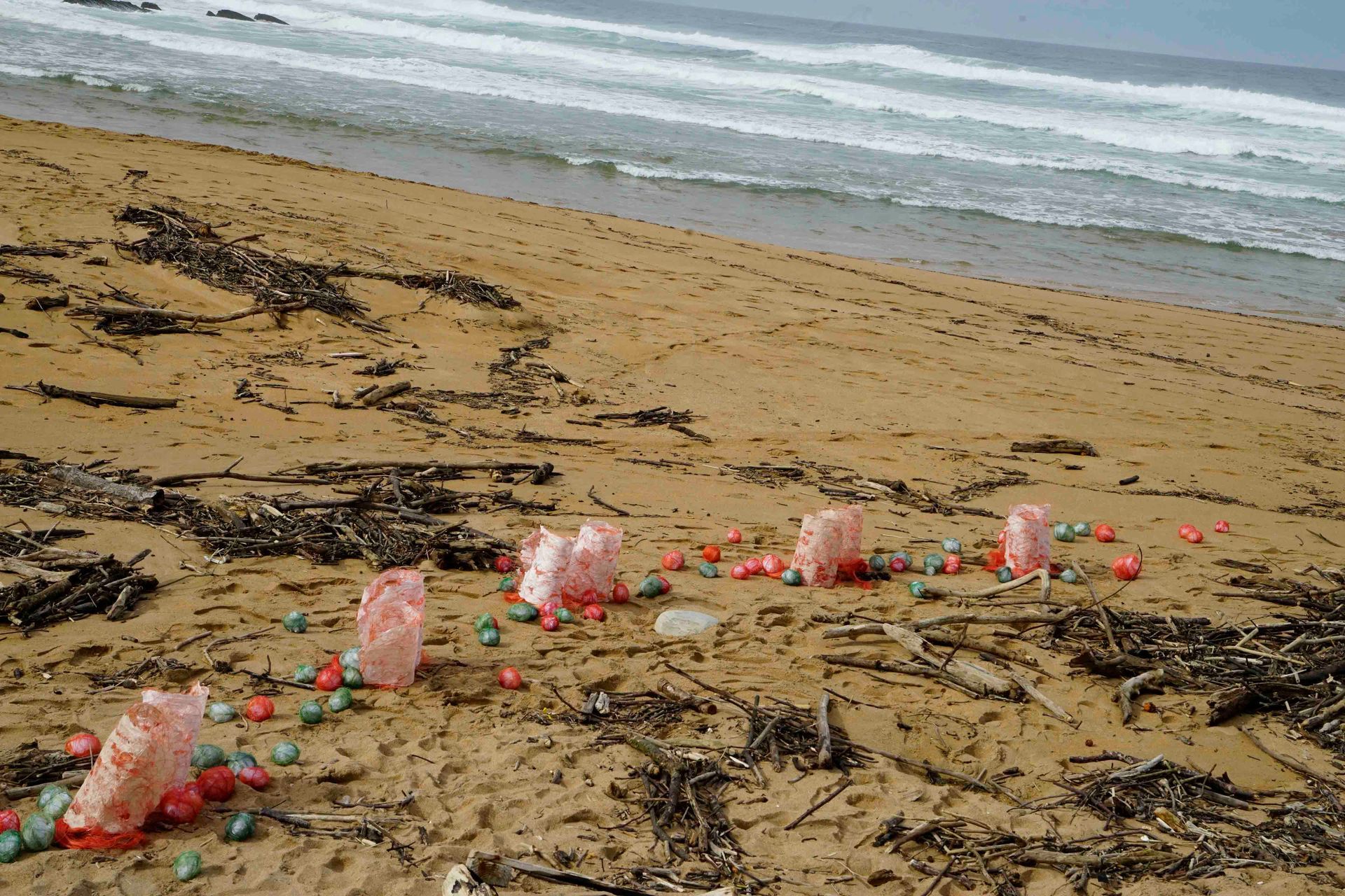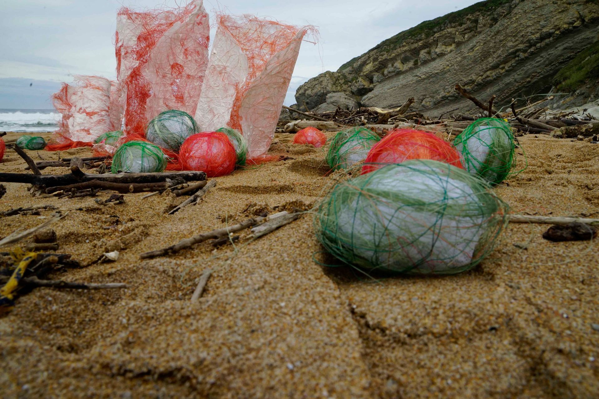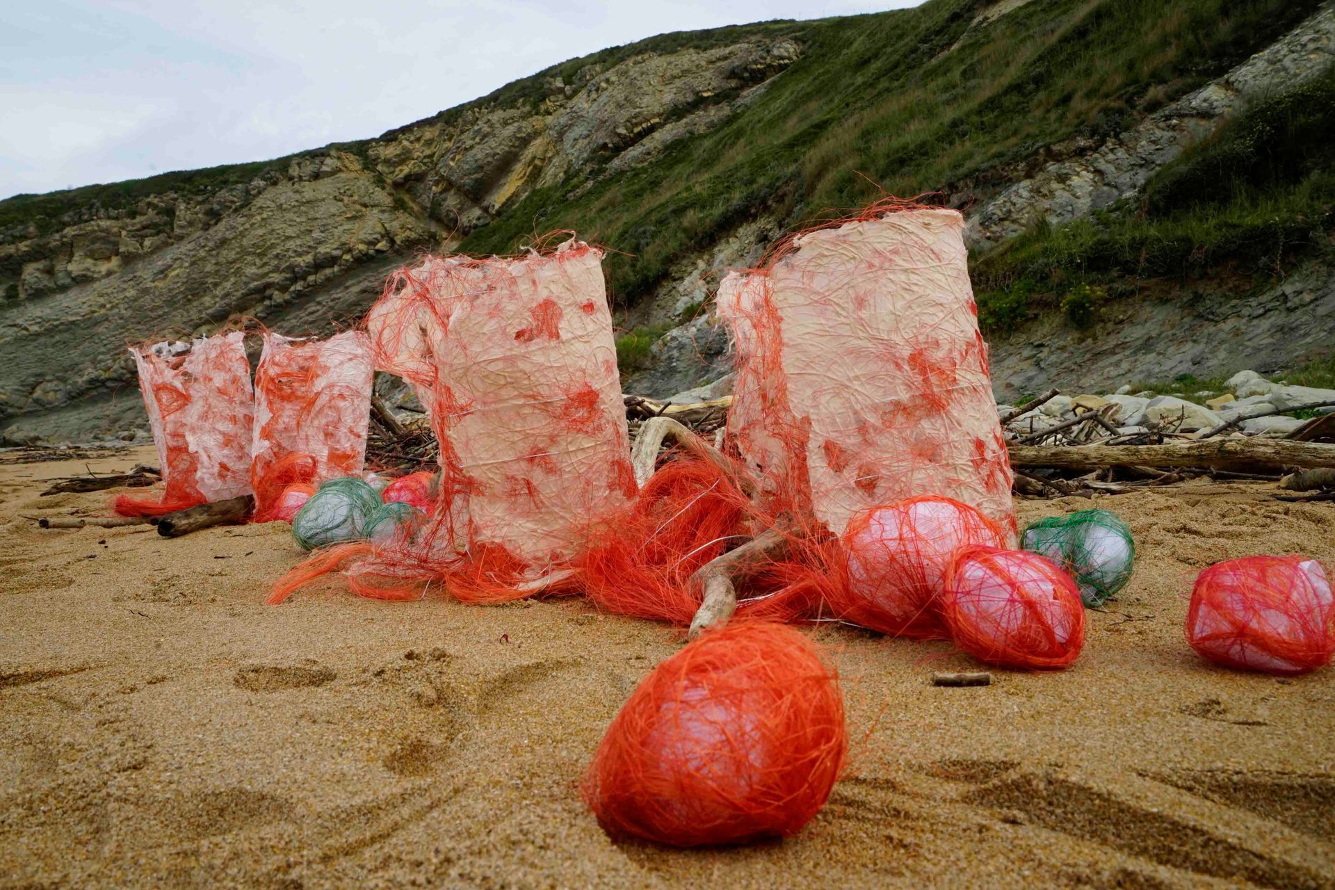 En la playa de Tagle, instalé objetos en forma de cilindros y bolas como huellas.
