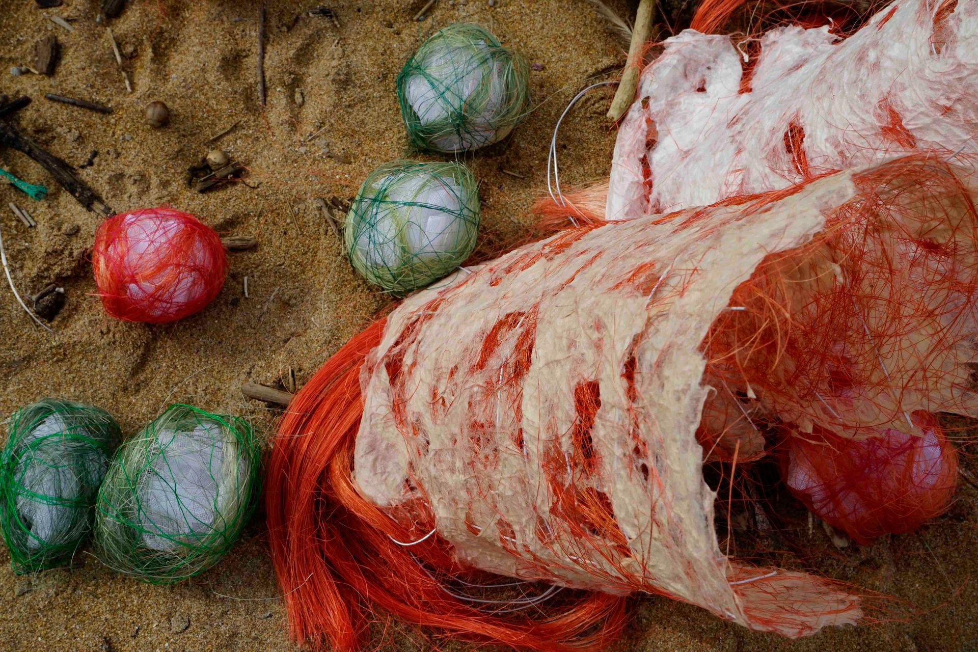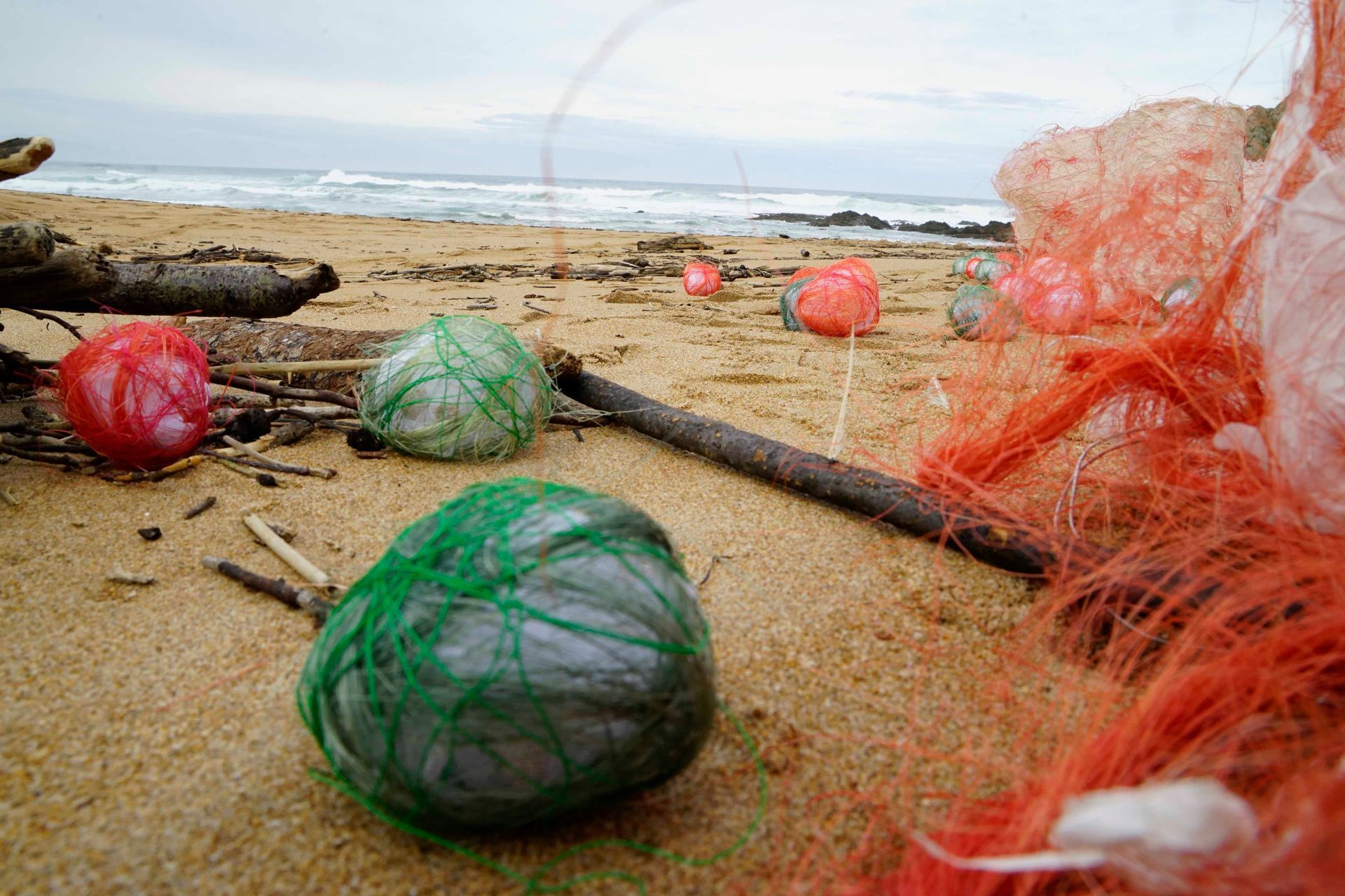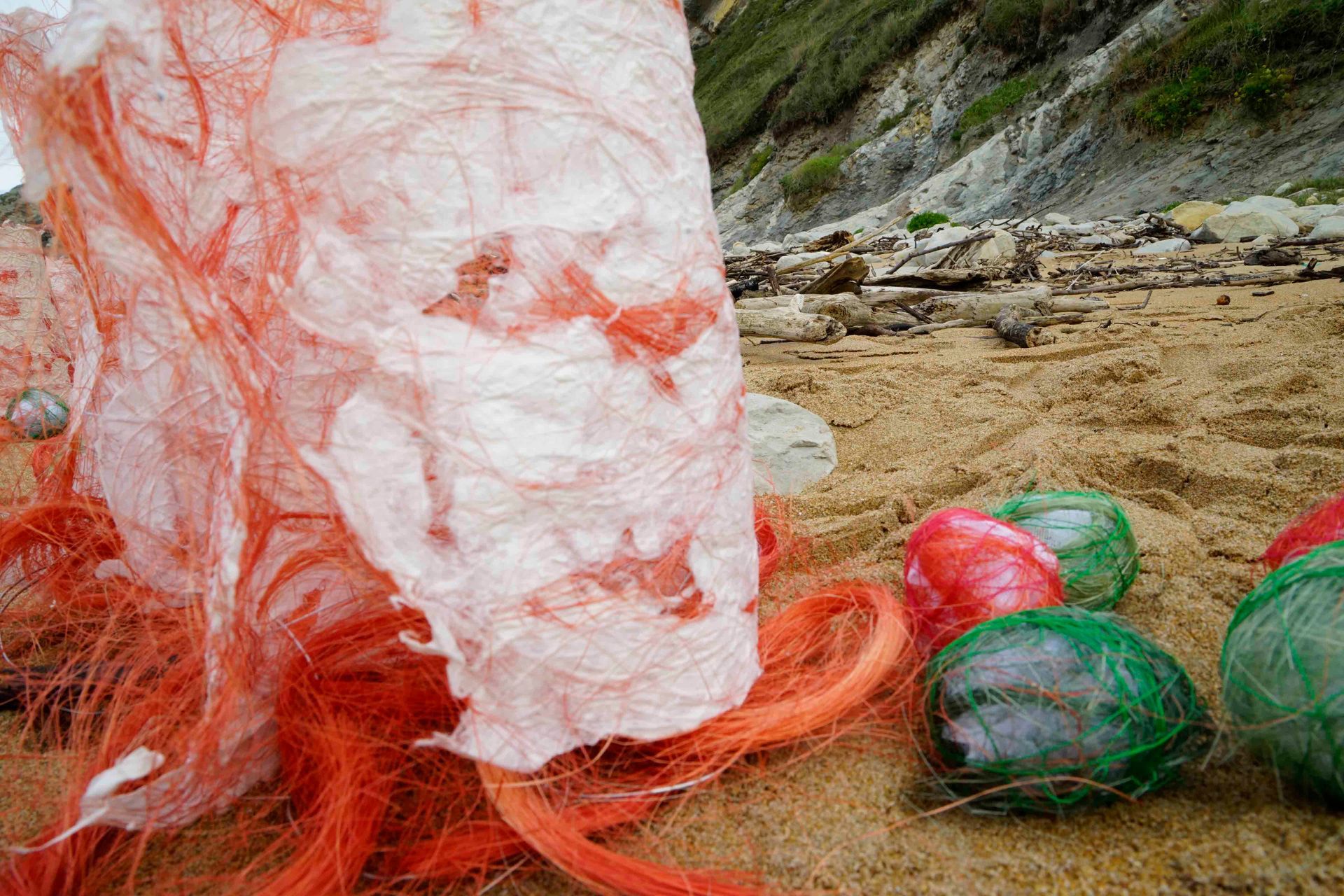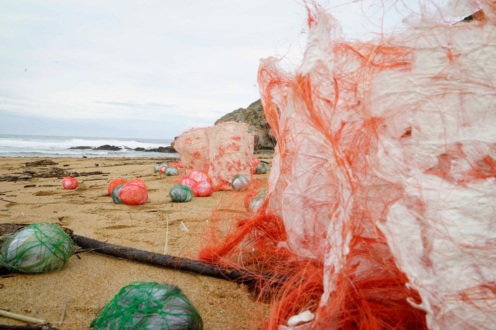 En la playa de Tagle, instalé objetos en forma de cilindros y bolas como huellas.