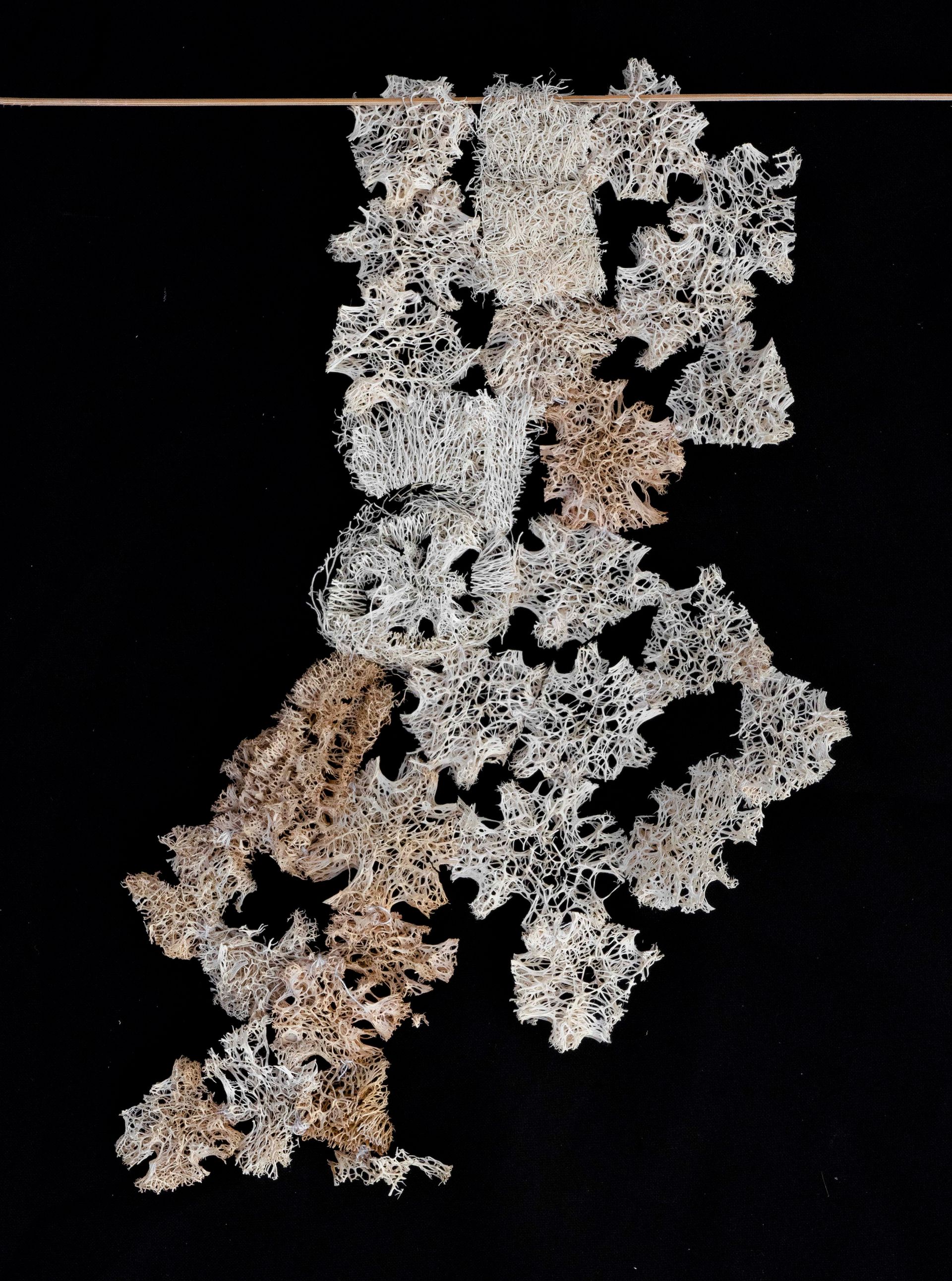 The sponge is elastic; cutting and spinning generates shapes, wefts, empty, open and closed spaces, edges-overflows; they are united, loose, embroidered in the air.